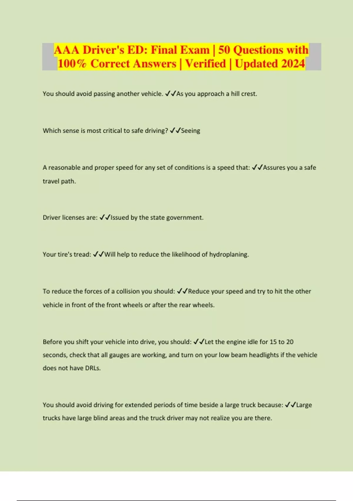 AAA Driver's ED: Final Exam | 50 Questions with 100% Correct Answers | Verified | Updated 2024
