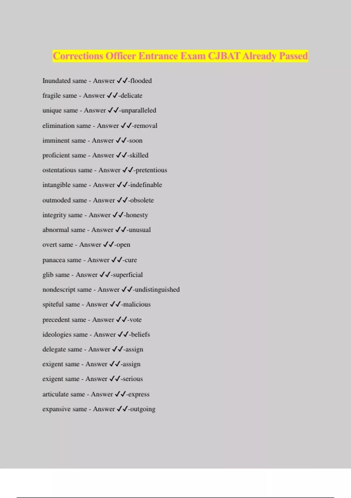 Corrections Officer Entrance Exam CJBAT Already Passed Inundated same - Answer ️️ -flooded fragile same - Answer ️️ -delicate unique same - Answer ️️ -unparalleled elimination same - Answer ️️ -removal imminent same - Answer ️️ -soon proficient same - Answer ️️ -skilled ostentatious same - Answer ️️ -pretentious intangible same - Answer ️️ -indefinable outmoded same - Answer ️️ -obsolete integrity same - Answer ️️ -honesty abnormal same - Answer ️️ -unusual overt same - Answer ️️ -open panacea same - Answer ️️ -cure glib same - Answer ️️ -superficial nondescript same - Answer ️️ -undistinguished spiteful same - Answer ️️ -malicious precedent same - Answer ️️ -vote ideologies same - Answer ️️ -beliefs delegate same - Answer ️️ -assign exigent same - Answer ️️ -assign exigent same - Answer ️️ -serious articulate same - Answer ️️ -express expansive same - Answer ️️ -outgoing