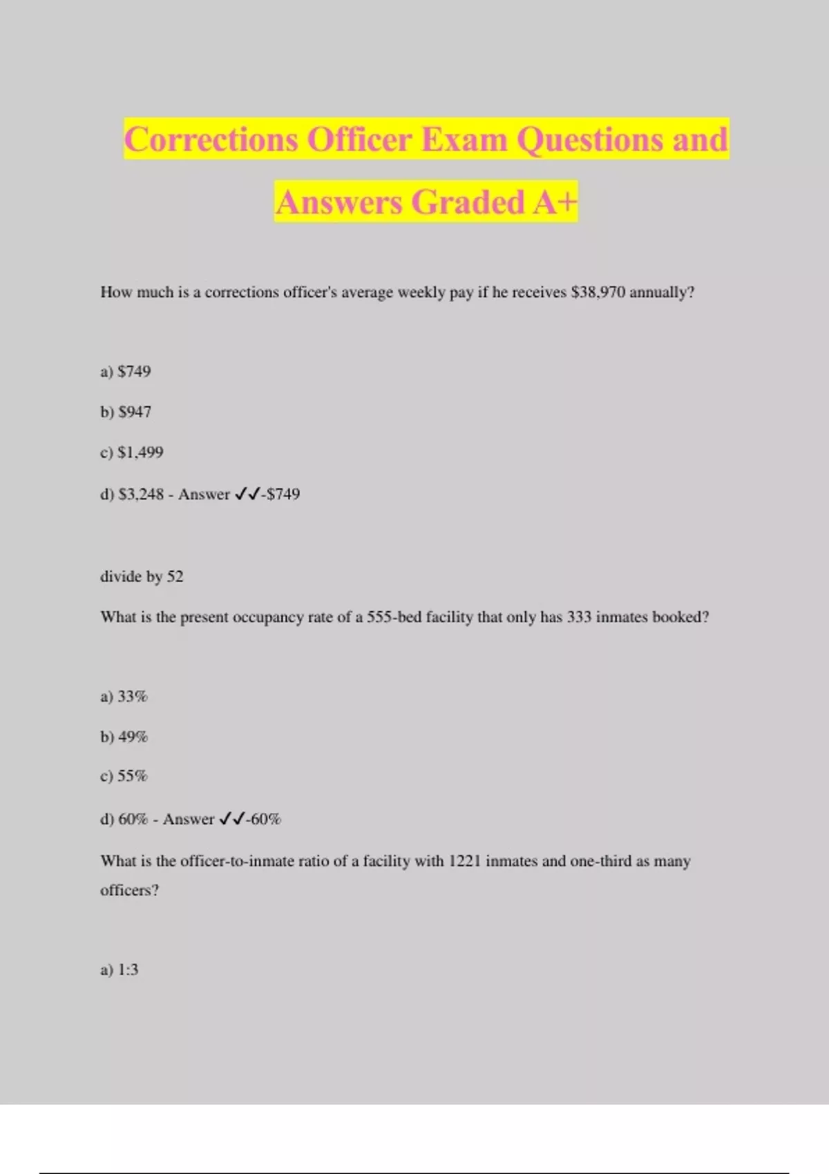 Corrections Officer Exam Questions and Answers Graded A+ How much is a corrections officer's average weekly pay if he receives $38,970 annually? a) $749 b) $947 c) $1,499 d) $3,248 - Answer ️️ -$749 divide by 52 What is the present occupancy rate of a 555-bed facility that only has 333 inmates booked? a) 33% b) 49% c) 55% d) 60% - Answer ️️ -60% What is the officer-to-inmate ratio of a facility with 1221 inmates and one-third as many officers? a) 1:3 b) 1:12.21 c) 1:407 d) 1:610.5 - Answer ️️ -1:407 divide inmate population by 3 How many seconds will it take to get a seriously injured inmate to a medical center if the distance between the two points is 48 miles, assuming that the transport vehicle runs at a constant speed of 32mph and does not experience traffic or any delays? a) 18,000 b) 5,400 c) 667 d) 90 - Answer ️️ -5,400 Divide the distance by constant speed to get 1.5 hours. Divide the answer by 60 (minutes in an hour), then by 60 (seconds in a minute). Remember that the question is seeking an answer expressed in seconds. How much quarterly budget should be allocated for a facility that spends an average of $30,000 annually for each of its 611 inmates? a) $4.58 million b) $6.11 million c) $9.17 million d) $18.33 million - Answer ️️ -$4.58 Million Multiply the annual per-head allocation by the number of inmates to get $18,330,000. Divide the answer by 4 to get the quarterly budget. During training, you are _________ to listen to the instructor carefully and follow directions to the letter. a) suppose b) supposed c) supposedly d) supposibly - Answer ️️ -supposed Officers ZYX and WVU _________ exercised brute force when they were ordering the two inmates to stop arguing. a) wouldn't of b) shouldn't have c) couldn't be d) didn't at - Answer ️️ -shouldn't have In corrections, one of the _________ effects of delivering substandard service is endangering the community. a) adversary b) aversionary c) averse d) adverse - Answer ️️ -adverse Corrections officers may be given due recognition for _________ exemplary service. a) their b) they're c) there d) there's - Answer ️️ -their _________ operations involve medium- to maximum-security systems and high-level officer training. a) Penitentiary b) Dormitory c) Recidivist d) Frisking - Answer ️️ -Penitentiary In writing an incident report, what critical information must be present at all times? a) place for submitting the report b) date and time of incident c) names of all possible suspects d) all of the above - Answer ️️ -date and time of the incident Why is it necessary for corrections officers to sign incident reports? a) to ensure authenticity and accuracy in their submissions b) to guarantee the truthfulness of witness statements c) to set an example of integrity in the corrections service d) none of the above - Answer ️️ -to ensure authenticity and accuracy in their submissions What two traits should Officer SQR exhibit if an angry advocate of prison reforms phoned the facility and ranted about its unethical practices, shouted expletives, and threatened to lobby the facility's permanent closure? a) assertiveness and authority b) benevolence and determination c) courtesy and tact d) honesty and courage - Answer ️️ -courtesy & tact What is the basic rule for corrections officers on the matter of handling journalists, who wish to conduct an ambush interview on the general state of the facility and conditions of inmates? a) direct these journalists to facility administrators b) ask them to present a letter of recommendation from the courts c) respond to all questions with urgency, honesty, and diplomacy d) request them to conduct a written interview instead, so there will be time to review the responses - Answer ️️ -direct these journalists to facility administr