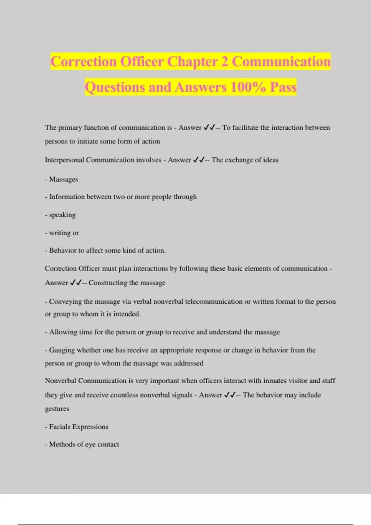 Correction Officer Chapter 2 Communication Questions and Answers 100% Pass The primary function of communication is - Answer ️️ -- To facilitate the interaction between persons to initiate some form of action Interpersonal Communication involves - Answer ️️ -- The exchange of ideas - Massages - Information between two or more people through - speaking - writing or - Behavior to affect some kind of action. Correction Officer must plan interactions by following these basic elements of communication - Answer ️️ -- Constructing the massage - Conveying the massage via verbal nonverbal telecommunication or written format to the person or group to whom it is intended. - Allowing time for the person or group to receive and understand the massage - Gauging whether one has receive an appropriate response or change in behavior from the person or group to whom the massage was addressed Nonverbal Communication is very important when officers interact with inmates visitor and staff they give and receive countless nonverbal signals - Answer ️️ -- The behavior may include gestures - Facials Expressions - Methods of eye contact - Postures whether Seated or Standing that send a strong massage - Officer may may observe that an inmates verbal expression are inconsistent with his or her facial expression - Postures or other nonverbal cues Nonverbal communication - Answer ️️ -- Should reinforce or complement verbal communication A Nonverbal Cue is - Answer ️️ -- The used of posture - Facial expression and body movement to communicate - as opposed to speaking or writing - nonverbal cues will help an officer analyze an inmates responses - Clenched fists pacing briskly clenched teeth or clear reluctance to communicate may indicate anger rage or irritation Each situation must be addressed - Answer ️️ -- Individually - Various cultural - social considerations must be taken into account before interpreting nonverbal cues Barriers may result in miscommunication between - Answer ️️ -- Sender and Receiver of massage - Use of profane derogatory or disrespectful language - Stereotyping - Lack of cultural understanding Proper positioning officer should communicate - Answer ️️ -- Strength confidence - Interest through body languages and demeanor - When interacting with others a technique sometimes called Posture Effective listening requires giving full attention to what is being said and taking time to understand the massage without interrupting - Answer ️️ -- Maintaining eye contact facing the speaker and leaning slightly forward to confirm attentiveness through body languages - Keeping an open mind and avoiding bias in order to hear all the facts - Identifying key words that should alert what someone has said to the officer such as kill suicide getting out hang - Identifying the intensity of speech in terms of voice volume emotion pitch and tone - Paraphrasing back what someone has said to reassure him or her of the messages clarity - Asking questions for clarification or more information A verbal command - Answer ️️ -- Is an authoritative statement used influence or give orders to a person or group Command presence - Answer ️️ -- Is the way an officer projects an image of authority and confidence and lets inmates know that he or she is in charge and in control characteristics of officer command presence include personal appearance (uniform personal grooming and upright posture) poise confidence and a professional demeanor Courtesy - Answer ️️ -is act of being respectful when interacting with others and threating them in a dignified manner regardless of their status race gender appearance or behavior Generally when using the telephone - Answer ️️ -- Officer should greet the caller identify themselves and their location and use a non threating tone Officer use Radios - Answer ️️ -- To send and receive vital information Radio Usage includes - Answer ️️ -- Calling for assistance general communication - - Identifying inmates and visit