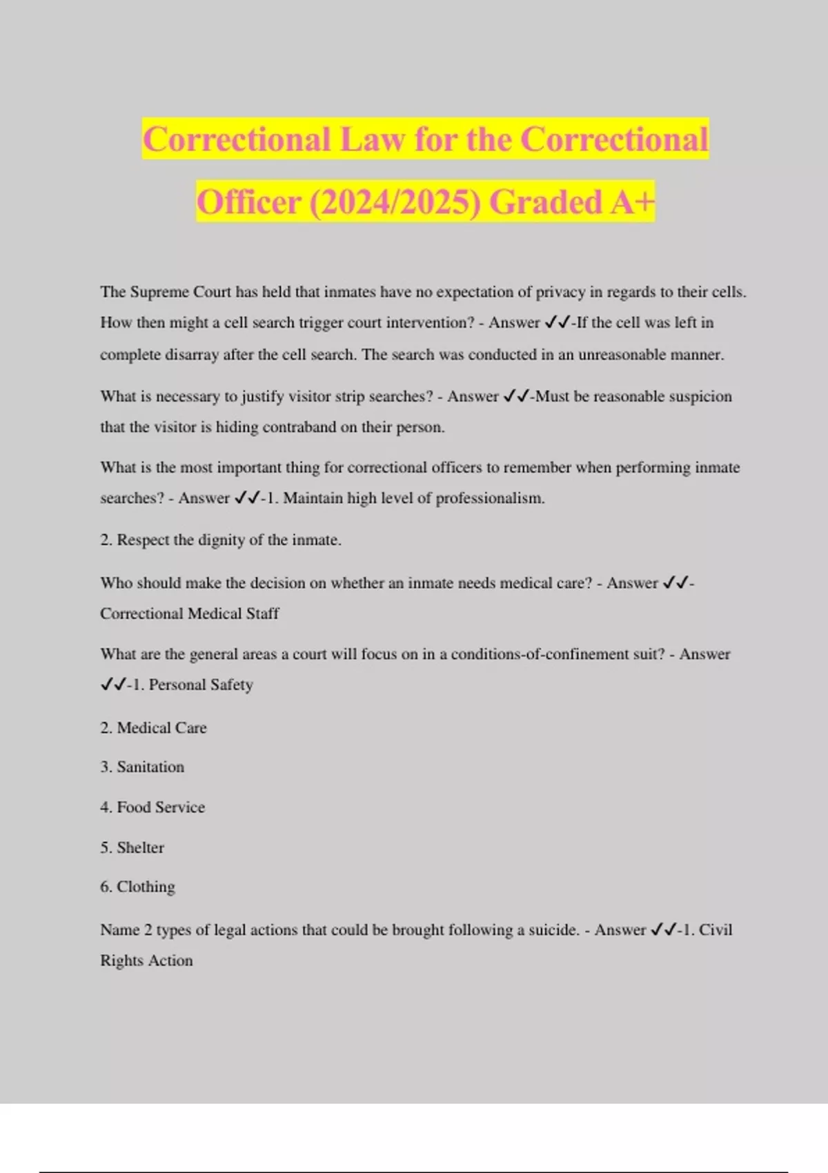 Correctional Law for the Correctional Officer (2024/2025) Graded A+ The Supreme Court has held that inmates have no expectation of privacy in regards to their cells. How then might a cell search trigger court intervention? - Answer ️️ -If the cell was left in complete disarray after the cell search. The search was conducted in an unreasonable manner. What is necessary to justify visitor strip searches? - Answer ️️ -Must be reasonable suspicion that the visitor is hiding contraband on their person. What is the most important thing for correctional officers to remember when performing inmate searches? - Answer ️️ -1. Maintain high level of professionalism. 2. Respect the dignity of the inmate. Who should make the decision on whether an inmate needs medical care? - Answer ️️ - Correctional Medical Staff What are the general areas a court will focus on in a conditions-of-confinement suit? - Answer ️️ -1. Personal Safety 2. Medical Care 3. Sanitation 4. Food Service 5. Shelter 6. Clothing Name 2 types of legal actions that could be brought following a suicide. - Answer ️️ -1. Civil Rights Action 2. Tort Suit What are 3 factual claims most likely to appear in a suicide case? - Answer ️️ -1. Failure to identify. 2. Failure to monitor. 3. Failure to respond. Give 2 examples of where an individual officers failures could provide the basis for a suicide lawsuit. - Answer ️️ -1. Failure to complete suicide screening questionnaire during intake process. 2. Failure to monitor an inmate according to policy. May deadly force be used to protect personal property? - Answer ️️ -No. Deadly force cannot be used to protect personal property. Only self defense and protecting others from death or serious harm. In some cases preventing escape. Why are there more procedural rights in a parole-revocation hearing than in a prison or jail disciplinary hearing? - Answer ️️ -Because Parole is seen as a form of conditional liberty. Basically, there is more at stake in a parole hearing versus a jail disciplinary hearing. Under what circumstances may a hearing officer rely on evidence from a witness whose identity is not disclosed to the inmate being charged with the offense? - Answer ️️ -When the hearing officer is convinced the informant is reliable by a corrections officer that knows the identity of the informant. However, unless informant is an eyewitness, the information is suspect. Under what circumstances is an agency likely to refuse to defend an employee sued by an inmate? - Answer ️️ -An agency is likely to refuse to defend an employee sued by an inmate when the employee acts outside the scope of his or her duties, and in bad faith. Is Sexual Harassment and Sexual Discrimination both against the law? - Answer ️️ -Yes, both are against the law. If an inmate is represented by appointed counsel in a criminal case, why is this not necessarily sufficient access to the courts? - Answer ️️ -Often court appointed counsel do not offer "meaningful access-to-the-courts. They are unable to provide advice or assistance outside of the criminal case. So once the inmate is sentenced they are no longer represented by that counsel. Why is crowding an important issue in condition of confinement suits? - Answer ️️ -Crowding is important in conditions of confinement suits because crowding often results in a breakdown of a facilities ability to provide inmates with their basic human needs. Give 4 reasons why detailed use-of-force reports are important. - Answer ️️ -1. Allows supervisors to evaluate the incident. 2. Allows the court to evaluate the incident. 3. Allows officers to review the details of the incident prior to testifying. 4. May be able to be introduced into evidence at a trial. Name 4 types of Discovery. - Answer ️️ -1. Depositio