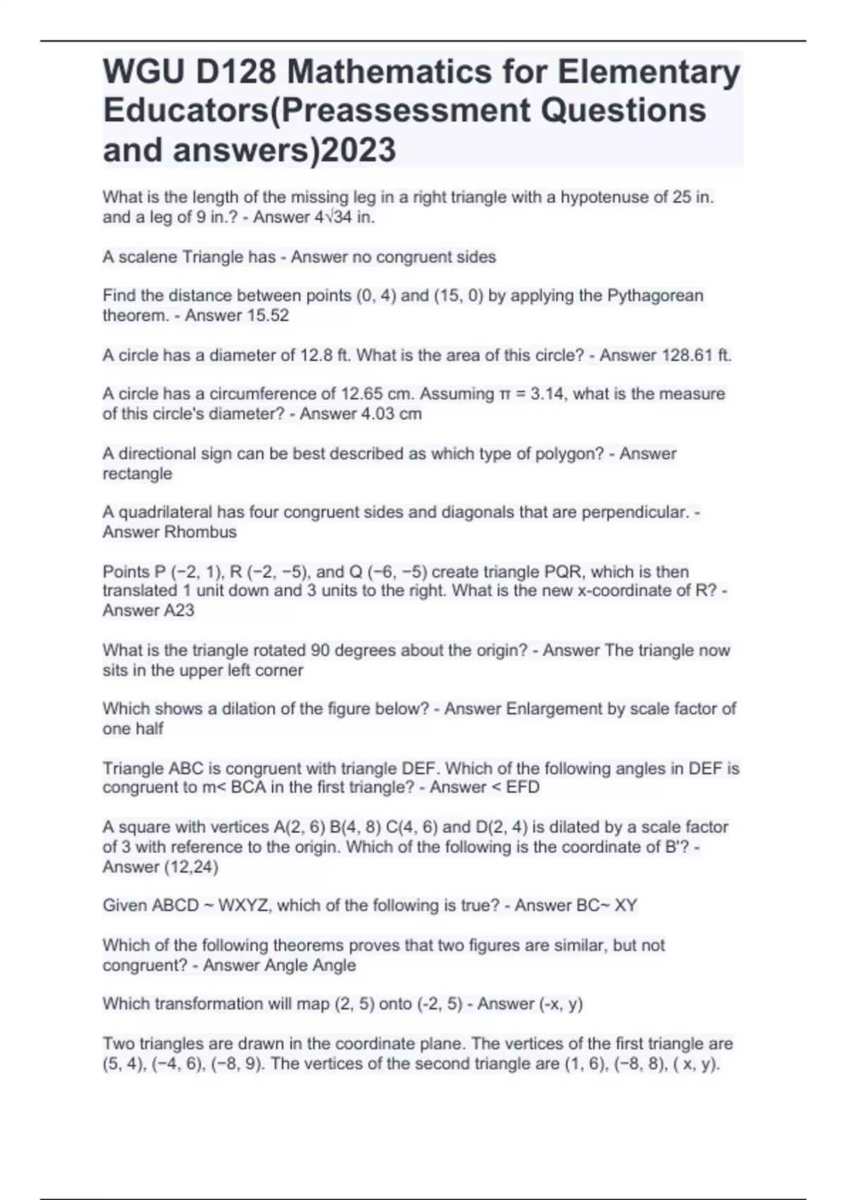 WGU D128 Mathematics for Elementary Educators(Preassessment Questions and Answers
