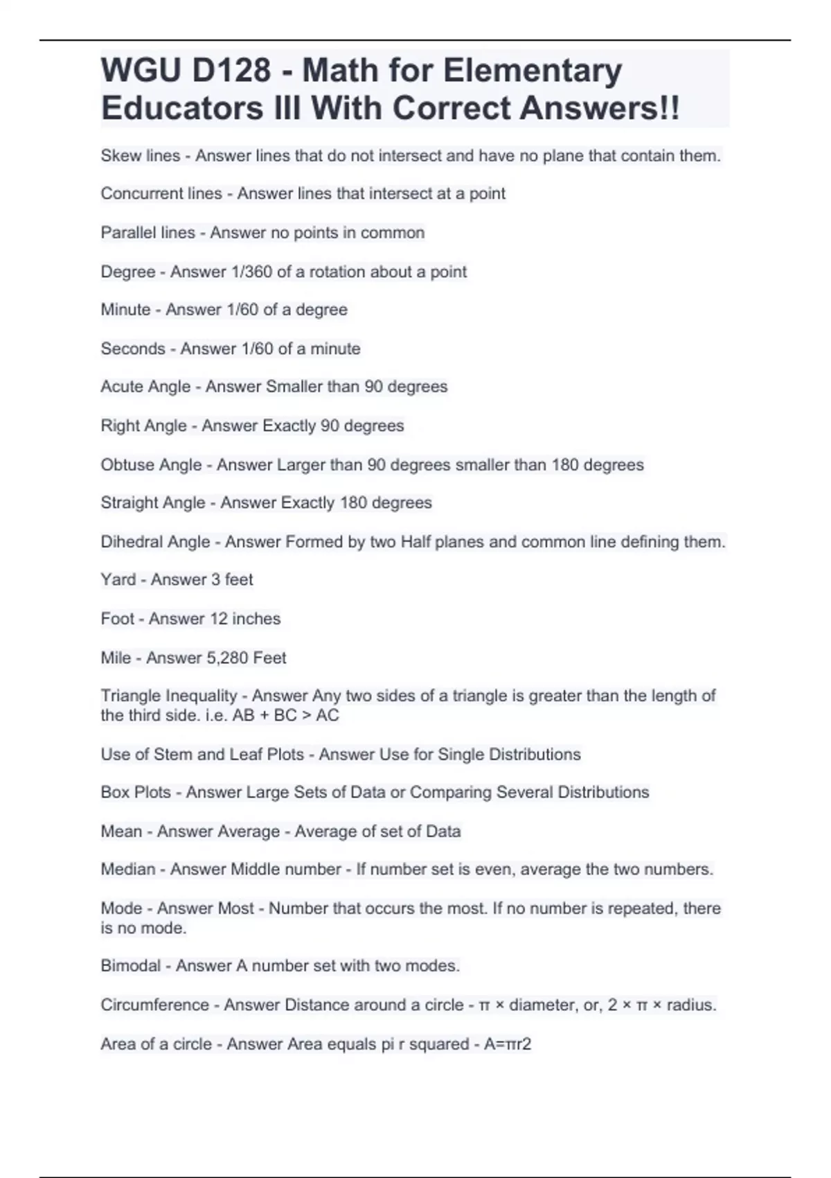 WGU D128 - Math for Elementary Educators III With Correct Answers!!.