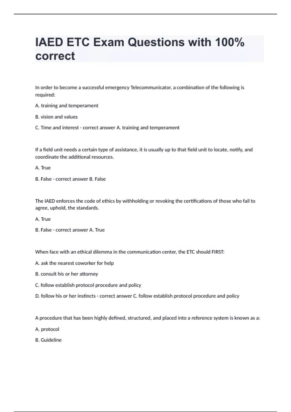 In order to become a successful emergency Telecommunicator, a combination of the following is required: A. training and temperament B. vision and values C. Time and interest - correct answer A. training and temperament If a field unit needs a certain type of assistance, it is usually up to that field unit to locate, notify, and coordinate the additional resources. A. True B. False - correct answer B. False The IAED enforces the code of ethics by withholding or revoking the certifications of those who fail to agree, uphold, the standards. A. True B. False - correct answer A. True When face with an ethical dilemma in the communication center, the ETC should FIRST: A. ask the nearest coworker for help B. consult his or her attorney C. follow establish protocol procedure and policy D. follow his or her instincts - correct answer C. follow establish protocol procedure and policy A procedure that has been highly defined, structured, and placed into a reference system is known as a: A. protocol B. Guideline C. Logarithm D. policy - correct answer A. protocol