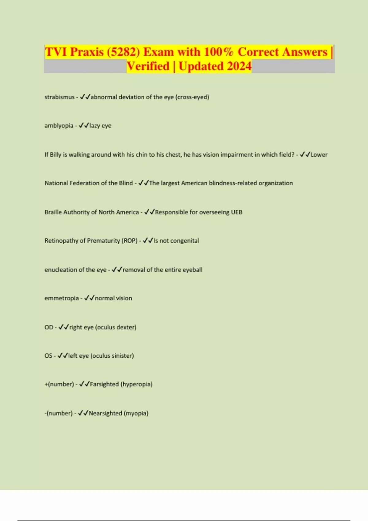 TVI Praxis (5282) Exam with 100% Correct Answers | Verified | Updated 2024
