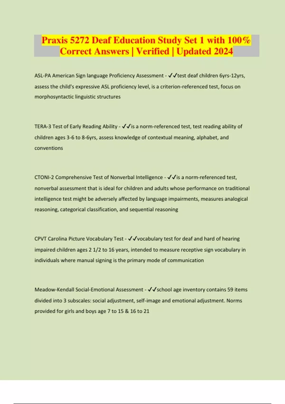 Deaf Education PRAXIS 5272 with 100% Correct Answers | Verified | Updated 2024