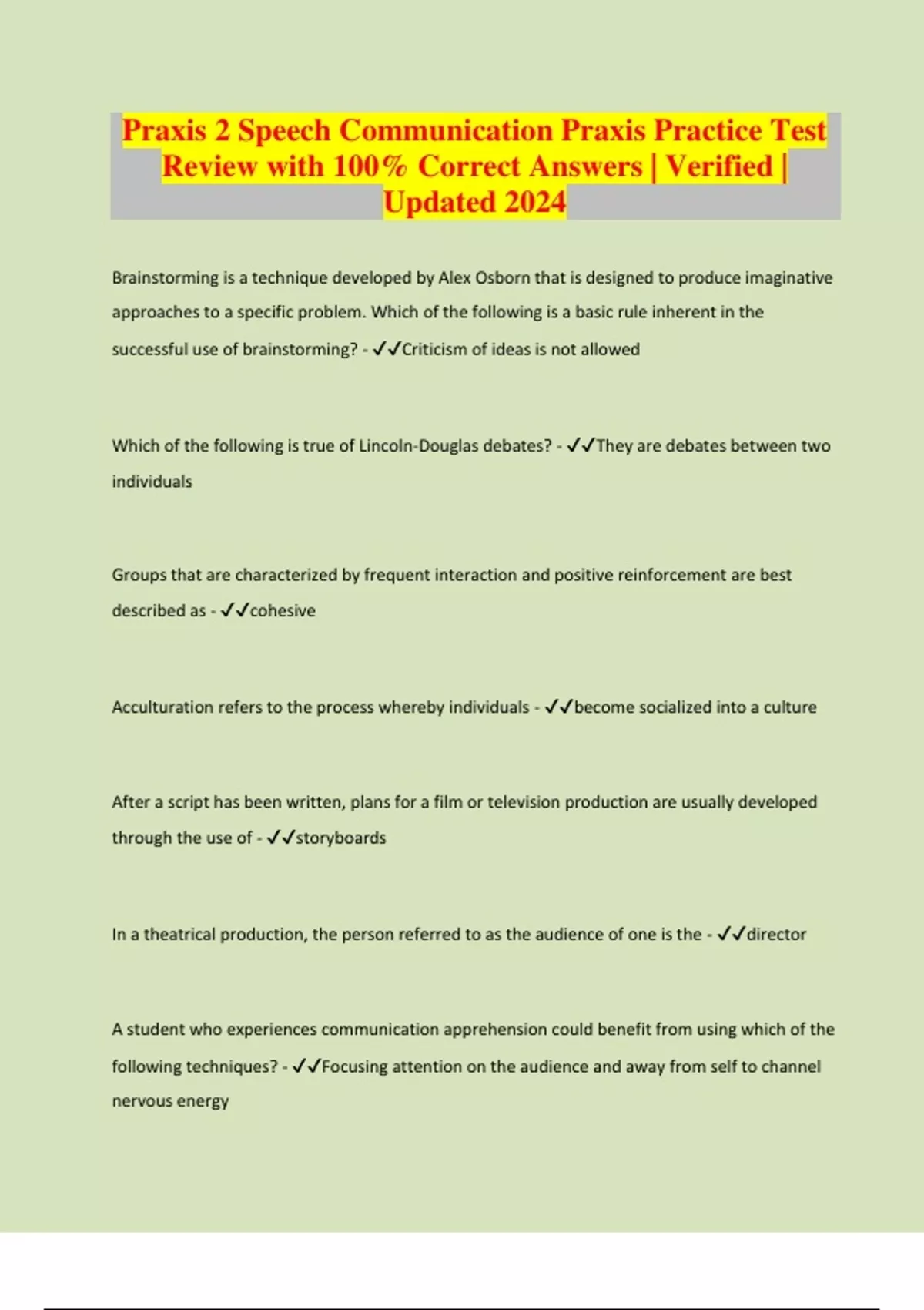 Praxis 2 Speech Communication Praxis Practice Test Review with 100% Correct Answers | Verified | Updated 2024