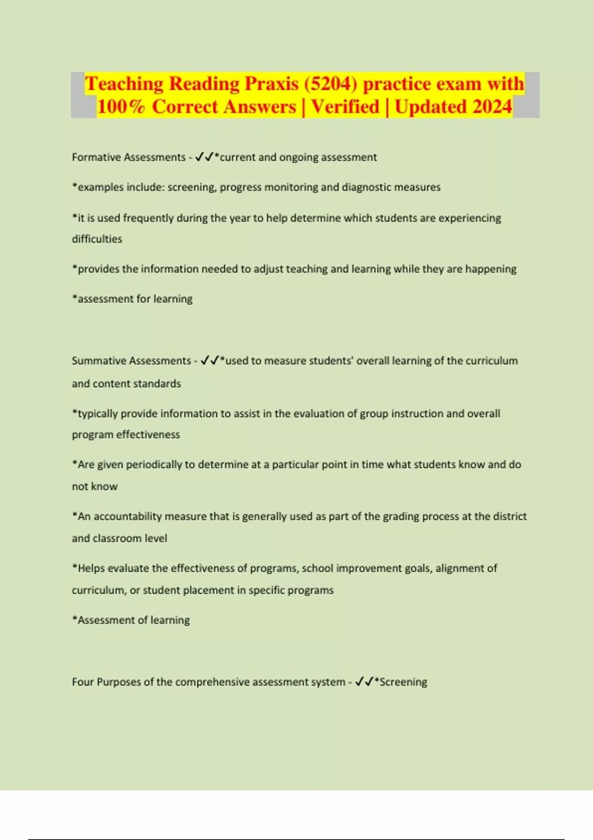 Teaching Reading Praxis (5204) practice exam with 100% Correct Answers | Verified | Updated 2024