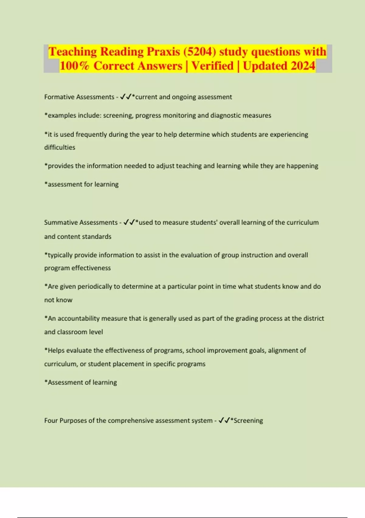 Teaching Reading Praxis (5204) study questions with 100% Correct Answers | Verified | Updated 2024