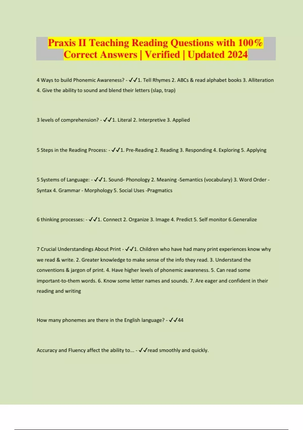 Praxis II Teaching Reading Questions with 100% Correct Answers | Verified | Updated 2024