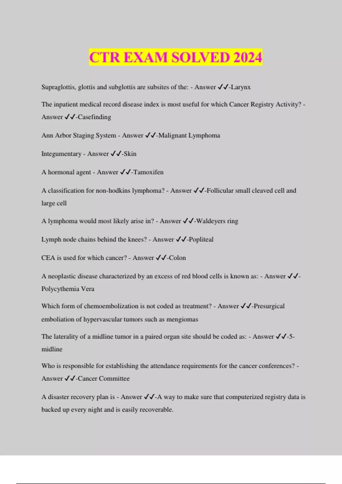 CTR EXAM SOLVED 2024 Supraglottis, glottis and subglottis are subsites of the: - Answer ️️ -Larynx The inpatient medical record disease index is most useful for which Cancer Registry Activity? - Answer ️️ -Casefinding Ann Arbor Staging System - Answer ️️ -Malignant Lymphoma Integumentary - Answer ️️ -Skin A hormonal agent - Answer ️️ -Tamoxifen A classification for non-hodkins lymphoma? - Answer ️️ -Follicular small cleaved cell and large cell A lymphoma would most likely arise in? - Answer ️️ -Waldeyers ring Lymph node chains behind the knees? - Answer ️️ -Popliteal CEA is used for which cancer? - Answer ️️ -Colon A neoplastic disease characterized by an excess of red blood cells is known as: - Answer ️️ - Polycythemia Vera Which form of chemoembolization is not coded as treatment? - Answer ️️ -Presurgical emboliation of hypervascular tumors such as mengiomas The laterality of a midline tumor in a paired organ site should be coded as: - Answer ️️ -5- midline Who is responsible for establishing the attendance requirements for the cancer conferences? - Answer ️️ -Cancer Committee A disaster recovery plan is - Answer ️️ -A way to make sure that computerized registry data is backed up every night and is easily recoverable. The best source for casefinding is: - Answer ️️ -Pathology reports The 5 key components of an approved cancer program: - Answer ️️ -Cancer Committee, Conferences, Quality Improvement, Cancer Registry and Clinical Services. A program receives non-accreditation at survey if there are ____ deficincies - Answer ️️ -8 An example of a protected health information in a cancer abstract is: - Answer ️️ -Name of patient The COC requires that cases submitted to the NCDB for the most recent accession year must satisfy the established criteria by ________? - Answer ️️ -As designated in the Call for Data. The date of diagnosis for a patient diagnosed in utero: - Answer ️️ -Is the actual date of diagnosis. If a patient is multiracial and one of the races is Hawaiian: - Answer ️️ -Hawaiian should be coded as race number one. One of the reasons for coding if cases were diagnosed by ambiguous terminology is: - Answer ️️ -To better understand how frequently these terms are used for diagnosis. A cancer registrar who is abstracting can be the coordinator of: - Answer ️️ -Cancer Registry quality control The first course of treatment consists of - Answer ️️ -All Cancer-directed treatment regardless of where it takes place. The accession number - Answer ️️ -Never changes even if the refere