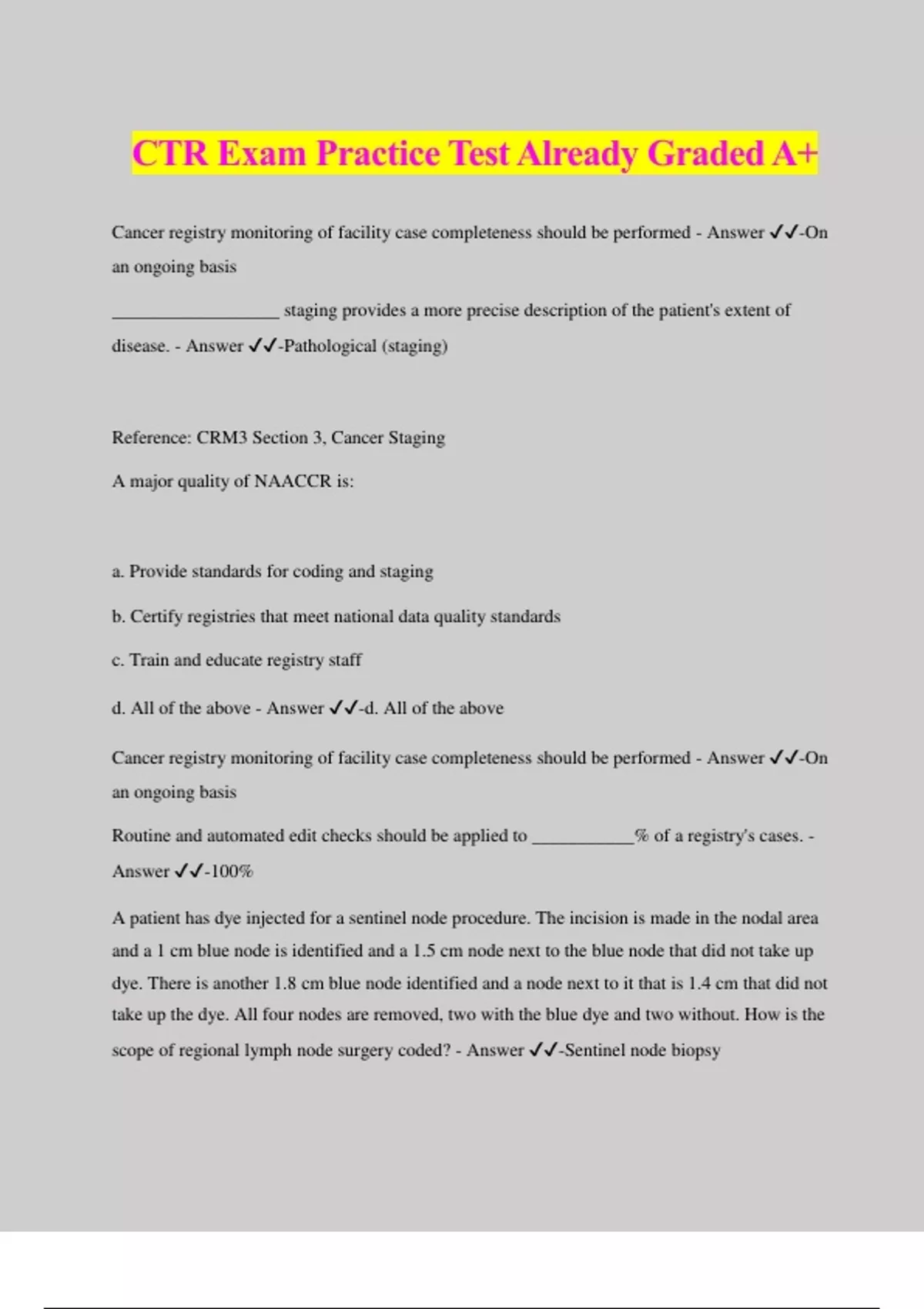 CTR Exam Practice Test Already Graded A+ Cancer registry monitoring of facility case completeness should be performed - Answer ️️ -On an ongoing basis __________________ staging provides a more precise description of the patient's extent of disease. - Answer ️️ -Pathological (staging) Reference: CRM3 Section 3, Cancer Staging A major quality of NAACCR is: a. Provide standards for coding and staging b. Certify registries that meet national data quality standards c. Train and educate registry staff d. All of the above - Answer ️️ -d. All of the above Cancer registry monitoring of facility case completeness should be performed - Answer ️️ -On an ongoing basis Routine and automated edit checks should be applied to ___________% of a registry's cases. - Answer ️️ -100% A patient has dye injected for a sentinel node procedure. The incision is made in the nodal area and a 1 cm blue node is identified and a 1.5 cm node next to the blue node that did not take up dye. There is another 1.8 cm blue node identified and a node next to it that is 1.4 cm that did not take up the dye. All four nodes are removed, two with the blue dye and two without. How is the scope of regional lymph node surgery coded? - Answer ️️ -Sentinel node biopsy Reference: AJCC 8th Edition, Chapter 1 Sentinel node biopsy because removing additional abnormal nodes during the sentinel node procedure does not change this from being a sentinel node procedure. According to the CoC standard, the maximum number of cases to be evaluated, annually, are: - Answer ️️ -300 A major quality of NAACCR is: a. Provide standards for coding and staging b. Certify registries that meet national data quality standards c. Train and educate registry staff d. All of the above - Answer ️️ -d. All of the above The cancer committee monitors the program's Estimated Performance Rates (EPR) for all quality measures using.. - Answer ️️ -CP3R Clinical staging - Answer ️️ -Includes any information obtained about the extent of cancer before the start of definitive treatment. Reference: AJCC 8th Edition, Chapter 1 Routine and automated edit checks should be applied to ___________% of a registry's cases. - Answer ️️ -100% The diagnosis is "undifferentiated NK-cell leukemia." What is the grade/differentiation? - Answer ️️ -8 Reference: pg 22 of ICD-O-3 According to the CoC standard, the maximum number of cases to be evaluated, annually, are: - Answer ️️ -300 The timing of SEER Extent of Disease coding is limited to: - Answer ️️ -All information available through completion of surgeries in the first course of treatment or four months, whichever is longer. The cancer committee monitors the program's Estimated Performance Rates (EPR) for all quality measures using.. - Answer ️️ -CP3R Which of the following diagnoses is the exception to the rule that all leukemias should be coded to C42.1 bone marrow? - Answer ️️ -9930/3 myeloid sarcoma Reference: ICD-O-3 Rule E Myeloid sarcoma is a leukemic deposit in an organ or tissue & should be coded to the site of origin. The National Program of Cancer Registries (NPCR) requires central registries to do hospital casefinding or reabstracting audits on each hospital: - Answer ️️ -Every five years The first course of treatment: - Answer ️️ -Consists of all cancer-directed treatment regardless of where it takes place A patient is diagnosed with adenocarcinoma of the cecum in April 2010. He is diagnosed with adenocarcinoma of the ascending colon in April 2012. The clinician says this is recurrent carcinoma. The pathologist does not review the original pathology from the cecal primary. Is this a single or multiple primary and what is the correct site code? - Answer ️️ -C18.2 multiple When the primary site of neuroblastoma is not given, code the primary site to - Answer ️️ - peripheral nerve of that organ. Patient with advanced right breast cancer has the following procedures given as the planned first course of treatment. 6/8/20xx Biopsy of the right axillary lymph node. One lymph node positive for infiltrating ductal carcinoma consistent with breast primary