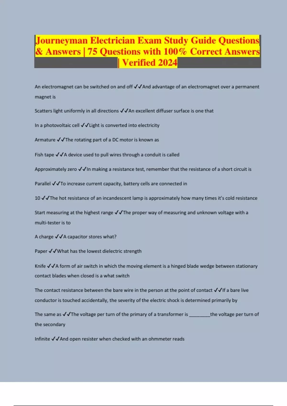 Journeyman Electrician Exam Study Guide Questions & Answers | 75 Questions with 100% Correct Answers | Verified 2024