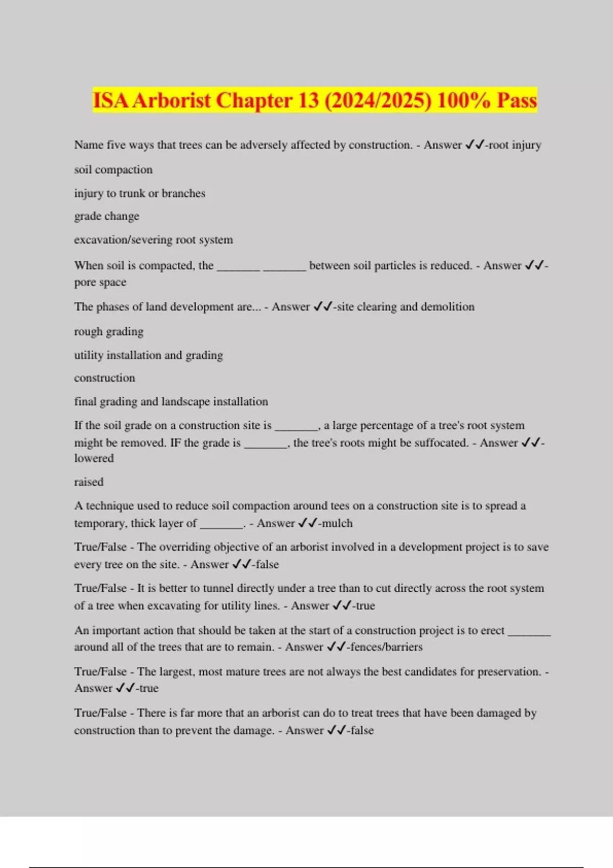 ISA Arborist Chapter 13 (2024/2025) 100% Pass Name five ways that trees can be adversely affected by construction. - Answer ️️ -root injury soil compaction injury to trunk or branches grade change excavation/severing root system When soil is compacted, the _______ _______ between soil particles is reduced. - Answer ️️ - pore space The phases of land development are... - Answer ️️ -site clearing and demolition rough grading utility installation and grading construction final grading and landscape installation If the soil grade on a construction site is _______, a large percentage of a tree's root system might be removed. IF the grade is _______, the tree's roots might be suffocated. - Answer ️️ - lowered raised A technique used to reduce soil compaction around tees on a construction site is to spread a temporary, thick layer of _______. - Answer ️️ -mulch True/False - The overriding objective of an arborist involved in a development project is to save every tree on the site. - Answer ️️ -false True/False - It is better to tunnel directly under a tree than to cut directly across the root system of a tree when excavating for utility lines. - Answer ️️ -true An important action that should be taken at the start of a construction project is to erect _______ around all of the trees that are to remain. - Answer ️️ -fences/barriers True/False - The largest, most mature trees are not always the best candidates for preservation. - Answer ️️ -true True/False - There is far more that an arborist can do to treat trees that have been damaged by construction than to prevent the damage. - Answer ️️ -false