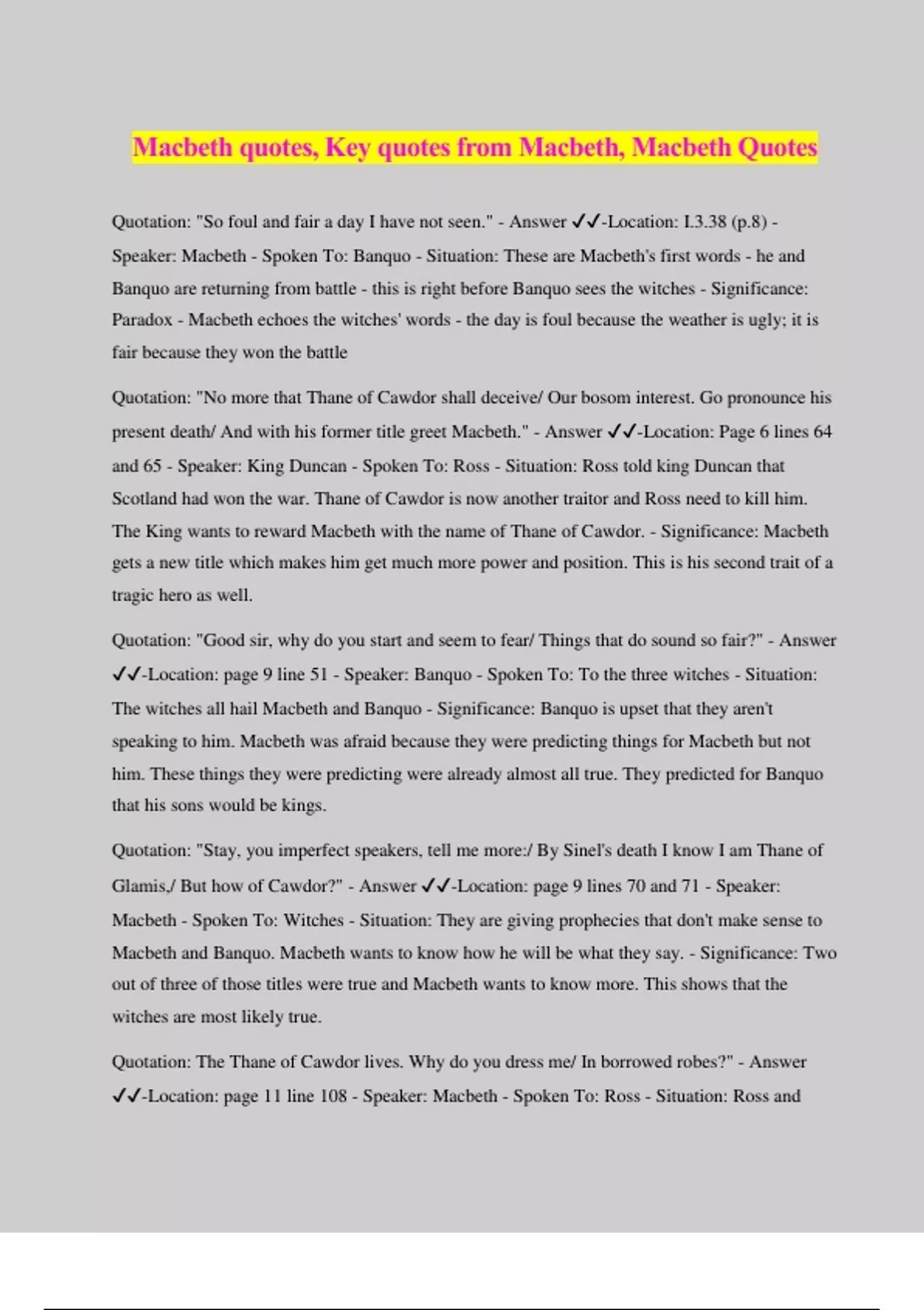 Macbeth quotes, Key quotes from Macbeth, Macbeth Quotes Quotation: "So foul and fair a day I have not seen." - Answer ✔️✔️-Location: I.3.38 (p.8) - Speaker: Macbeth - Spoken To: Banquo - Situation: These are Macbeth's first words - he and Banquo are returning from battle - this is right before Banquo sees the w itches - Significance: Paradox - Macbeth echoes the witches' words - the day is foul because the weather is ugly; it is fair because they won the battle Quotation: "No more that Thane of Cawdor shall deceive/ Our bosom interest. Go pronounce his present de ath/ And with his former title greet Macbeth." - Answer ✔️✔️-Location: Page 6 lines 64 and 65 - Speaker: King Duncan - Spoken To: Ross - Situation: Ross told king Duncan that Scotland had won the war. Thane of Cawdor is now another traitor and Ross need to kill him. The King wants to reward Macbeth with the name of Thane of Cawdor. - Significance: Macbeth gets a new title which makes him get much more power and position. This is his second trait of a tragic hero as well. Quotation: "Good sir, why do you sta rt and seem to fear/ Things that do sound so fair?" - Answer ✔️✔️-Location: page 9 line 51 - Speaker: Banquo - Spoken To: To the three witches - Situation: The witches all hail Macbeth and Banquo - Significance: Banquo is upset that they aren't speaking to him. Macbeth was afraid because they were predicting things for Macbeth but not him. These things they were predicting were already almost all true. They predicted for Banquo that his sons would be kings. Quotation: "Stay, you imperfect speakers, tell me more:/ By Sinel's death I know I am Thane of Glamis,/ But how of Cawdor?" - Answer ✔️✔️-Location: page 9 lines 70 and 71 - Speaker: Macbeth - Spoken To: Witches - Situation: They are giving prophecies that don't make sense to Macbeth and Banquo. Macbeth wa nts to know how he will be what they say. - Significance: Two out of three of those titles were true and Macbeth wants to know more. This shows that the witches are most likely true. Quotation: The Thane of Cawdor lives. Why do you dress me/ In borrowed ro bes?" - Answer ✔️✔️-Location: page 11 line 108 - Speaker: Macbeth - Spoken To: Ross - Situation: Ross and Angus deliver the news that Macbeth is the Thane of Cawdor. Macbeth thought the Thane of Cawdor was still alive. - Significance: Macbeth realizes that the witches are telling the truth to him. Quotation: This supernatural soliciting/ Cannot be ill, cannot be good. If ill,/ Why hath it given me earnest of success,/ Commencing in a truth?" - Answer ✔️✔️-Location: page 12 line 133 - Speaker: Macbeth - Spok en To: Banquo - Situation: He is trying to figure out if the prophecy is good or bad. He doesn't find it bad because he is now Thane of Cawdor. But he is still having bad thoughts on how he will become king (killing Duncan). - Significance: Macbeth says he will let fate take its course and not take action in the prophecies. He is not deciding his fate. Quotation: "There's no art/ To find the mind's construction in the face./ He was a gentleman on whom I built/ An absolute trust." - Answer ✔️✔️-Location: pag e 14 line 12 - Speaker: King Duncan - Spoken To: Malcom - Situation: King Duncan explained his trust that he put in the old Thane of Cawdor. - Significance: He is now going to put his trust in Macbeth since he knows he can trust him since he killed a trait or as well. Quotation: "We will establish our estate upon/ Our eldest, Malcolm, whom we name hereafter/ The Prince of Cumberland." - Answer ✔️✔️-Location: page 15 - Speaker: King Duncan - Spoken To: All of the men at the feast (Banquo and Macbeth) - Situat ion: He gives his son Malcolm the title of Prince of Cumberland and is now heir to the throne. - Significance: Macbeth realizes that now he has another person in his way before he becomes king. He calls upon the supernatural about his dark thoughts on kill ing both Duncan and Malcolm. Quotation: "Glamis thou art, and Cawdor and shalt be/ What thou art promised. Yet do I fear thy nature./ It is too full o' th' milk of human kindness/ To catch the nearest way." - Answer ✔️✔️-