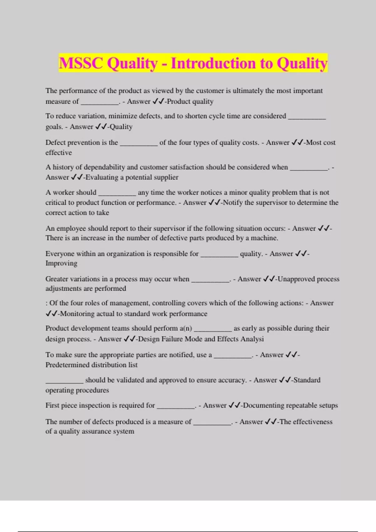 MSSC Quality - Introduction to Quality The performance of the product as viewed by the customer is ultimately the most important measure of __________. - Answer ️️ -Product quality To reduce variation, minimize defects, and to shorten cycle time are considered __________ goals. - Answer ️️ -Quality Defect prevention is the __________ of the four types of quality costs. - Answer ️️ -Most cost effective A history of dependability and customer satisfaction should be considered when __________. - Answer ️️ -Evaluating a potential supplier A worker should __________ any time the worker notices a minor quality problem that is not critical to product function or performance. - Answer ️️ -Notify the supervisor to determine the correct action to take An employee should report to their supervisor if the following situation occurs: - Answer ️️ - There is an increase in the number of defective parts produced by a machine. Everyone within an organization is responsible for __________ quality. - Answer ️️ - Improving Greater variations in a process may occur when __________. - Answer ️️ -Unapproved process adjustments are performed : Of the four roles of management, controlling covers which of the following actions: - Answer ️️ -Monitoring actual to standard work performance