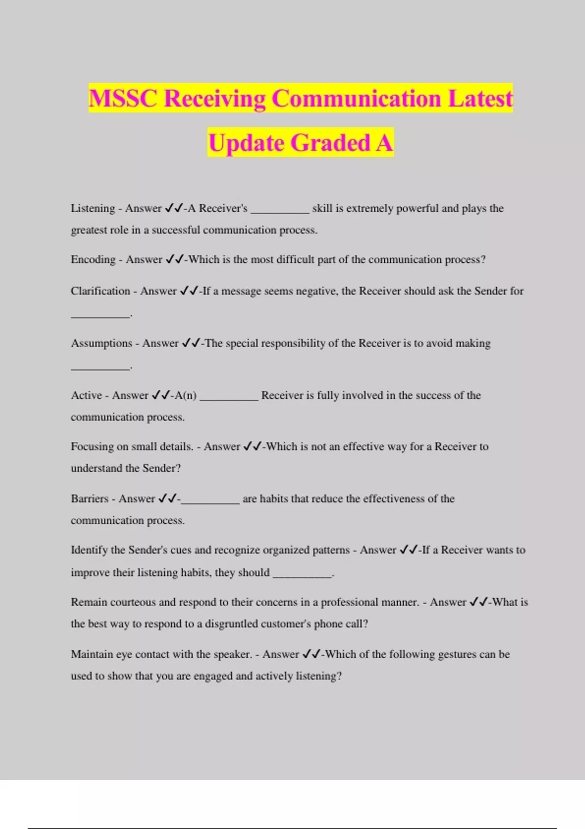MSSC Receiving Communication Latest Update Graded A Listening - Answer ️️ -A Receiver's __________ skill is extremely powerful and plays the greatest role in a successful communication process. Encoding - Answer ️️ -Which is the most difficult part of the communication process? Clarification - Answer ️️ -If a message seems negative, the Receiver should ask the Sender for __________. Assumptions - Answer ️️ -The special responsibility of the Receiver is to avoid making __________.