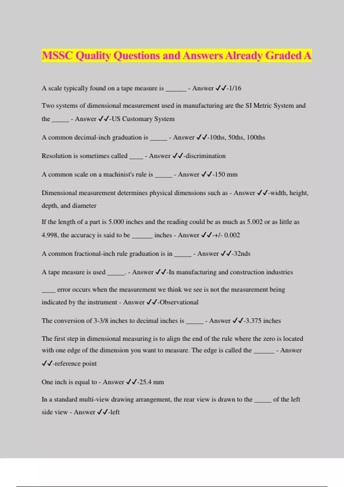 MSSC Quality Questions and Answers Already Graded A A scale typically found on a tape measure is ______ - Answer ️️ -1/16 Two systems of dimensional measurement used in manufacturing are the SI Metric System and the _____ - Answer ️️ -US Customary System A common decimal-inch graduation is _____ - Answer ️️ -10ths, 50ths, 100ths Resolution is sometimes called ____ - Answer ️️ -discrimination A common scale on a machinist's rule is _____ - Answer ️️ -150 mm Dimensional measurement determines physical dimensions such as - Answer ️️ -width, height, depth, and diameter If the length of a part is 5.000 inches and the reading could be as much as 5.002 or as little as 4.998, the accuracy is said to be ______ inches - Answer ️️ -+/- 0.002 A common fractional-inch rule graduation is in _____ - Answer ️️ -32nds A tape measure is used _____. - Answer ️️ -In manufacturing and construction industries ____ error occurs when the measurement we think we see is not the measurement being indicated by the instrument - Answer ️️ -Observational The conversion of 3-3/8 inches to decimal inches is _____ - Answer ️️ -3.375 inches The first step in dimensional measuring is to align the end of the rule where the zero is located with one edge of the dimension you want to measure. The edge is called the ______ - Answer ️️ -reference point One inch is equal to - Answer ️️ -25.4 mm In a standard multi-view drawing arrangement, the rear view is drawn to the _____ of the left side view - Answer ️️ -left
