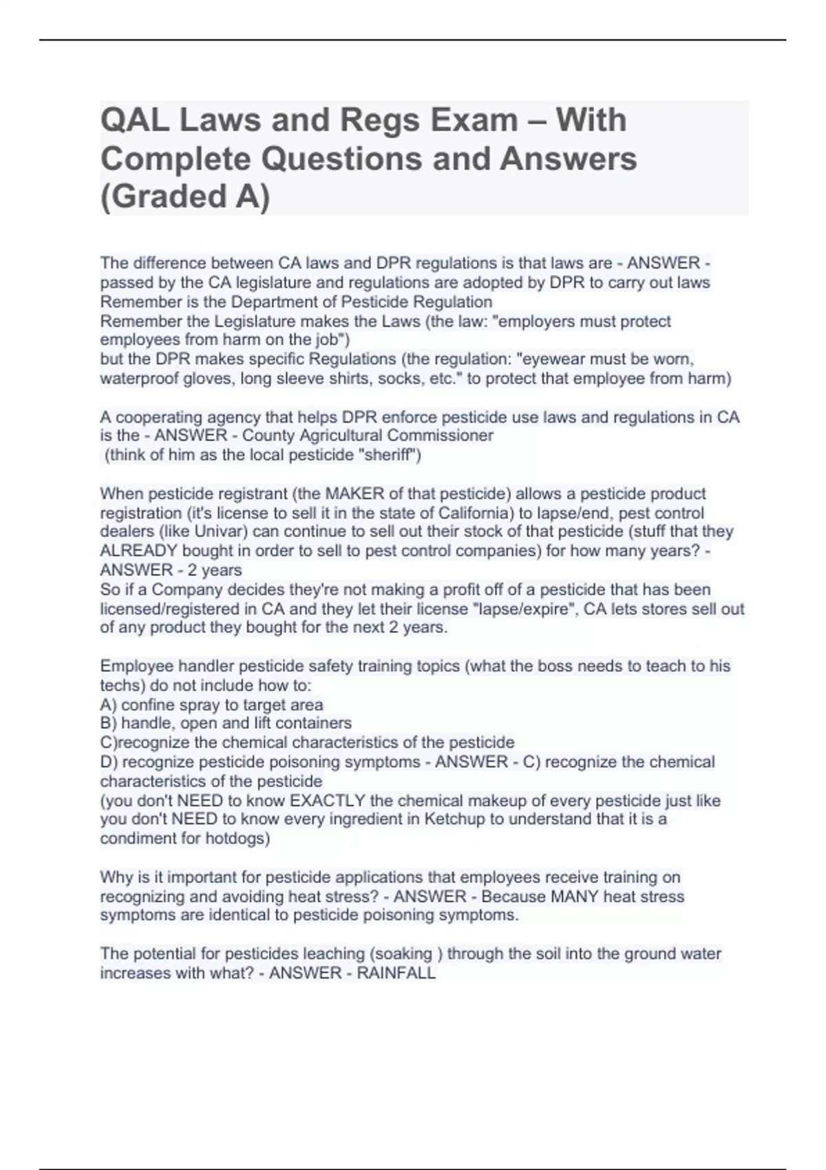 The difference between CA laws and DPR regulations is that laws are - ANSWER - passed by the CA legislature and regulations are adopted by DPR to carry out laws Remember is the Department of Pesticide Regulation Remember the Legislature makes the Laws (the law: "employers must protect employees from harm on the job") but the DPR makes specific Regulations (the regulation: "eyewear must be worn, waterproof gloves, long sleeve shirts, socks, etc." to protect that employee from harm) A cooperating agency that helps DPR enforce pesticide use laws and regulations in CA is the - ANSWER - County Agricultural Commissioner (think of him as the local pesticide "sheriff") When pesticide registrant (the MAKER of that pesticide) allows a pesticide product registration (it's license to sell it in the state of California) to lapse/end, pest control dealers (like Univar) can continue to sell out their stock of that pesticide (stuff that they ALREADY bought in order to sell to pest control companies) for how many years? - ANSWER - 2 years So if a Company decides they're not making a profit off of a pesticide that has been licensed/registered in CA and they let their license "lapse/expire", CA lets stores sell out of any product they bought for the next 2 years. Employee handler pesticide safety training topics (what the boss needs to teach to his techs) do not include how to: A) confine spray to target area B) handle, open and lift containers C)recognize the chemical characteristics of the pesticide D) recognize pesticide poisoning symptoms - ANSWER - C) recognize the chemical characteristics of the pesticide (you don't NEED to know EXACTLY the chemical makeup of every pesticide just like you don't NEED to know every ingredient in Ketchup to understand that it is a condiment for hotdogs) Why is it important for pesticide applications that employees receive training on recognizing and avoiding heat stress? - ANSWER - Because MANY heat stress symptoms are identical to pesticide poisoning symptoms. The potential for pesticides leaching (soaking ) through the soil into the ground water increases with what? - ANSWER - RAINFALL Rain washes pesticide deeper into the soil...we don't want it continuing down hundreds of feet into our drinking water beneath us) Arrange these label words from least dangerous to most dangerous: Warning/Danger/Caution - ANSWER - Caution, Warning, Danger Which signal world has the word poison and a skull and crossbones on the label? - ANSWER - DANGER What are the three signal words commonly used on all pesticides? - ANSWER - Danger, Warning, Caution The hazard (DANGER) of a pesticide is a relative measure of its potential to: A)Harm people or the environment B
