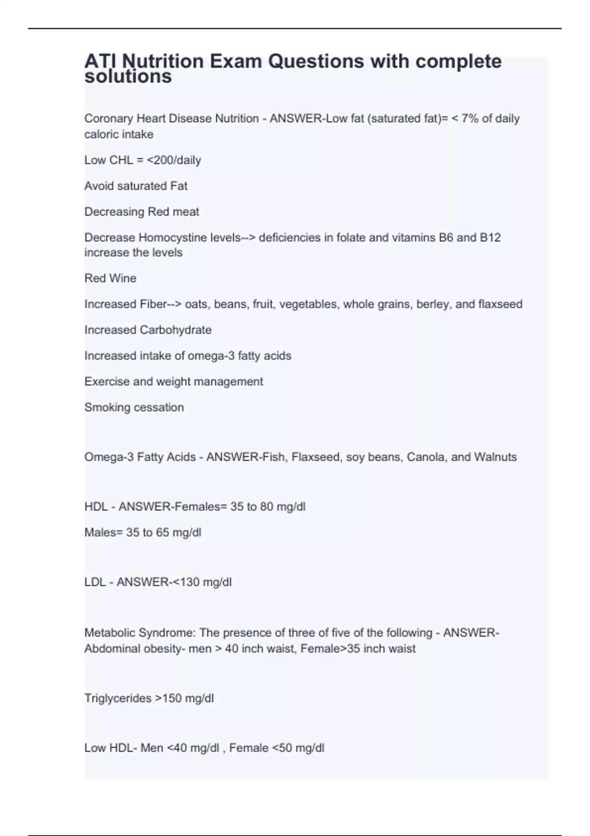 Coronary Heart Disease Nutrition - ANSWER-Low fat (saturated fat)= < 7% of daily caloric intake Low CHL = <200/daily Avoid saturated Fat Decreasing Red meat Decrease Homocystine levels--> deficiencies in folate and vitamins B6 and B12 increase the levels Red Wine Increased Fiber--> oats, beans, fruit, vegetables, whole grains, berley, and flaxseed Increased Carbohydrate Increased intake of omega-3 fatty acids Exercise and weight management Smoking cessation Omega-3 Fatty Acids - ANSWER-Fish, Flaxseed, soy beans, Canola, and Walnuts HDL - ANSWER-Females= 35 to 80 mg/dl Males= 35 to 65 mg/dl LDL - ANSWER-<130 mg/dl Metabolic Syndrome: The presence of three of five of the following - ANSWER-Abdominal obesity- men > 40 inch waist, Female>35 inch waist Triglycerides >150 mg/dl Low HDL- Men <40 mg/dl , Female <50 mg/dl Increased BP-- 130/85 Fasting BG > than or equal to 110 mg/dl