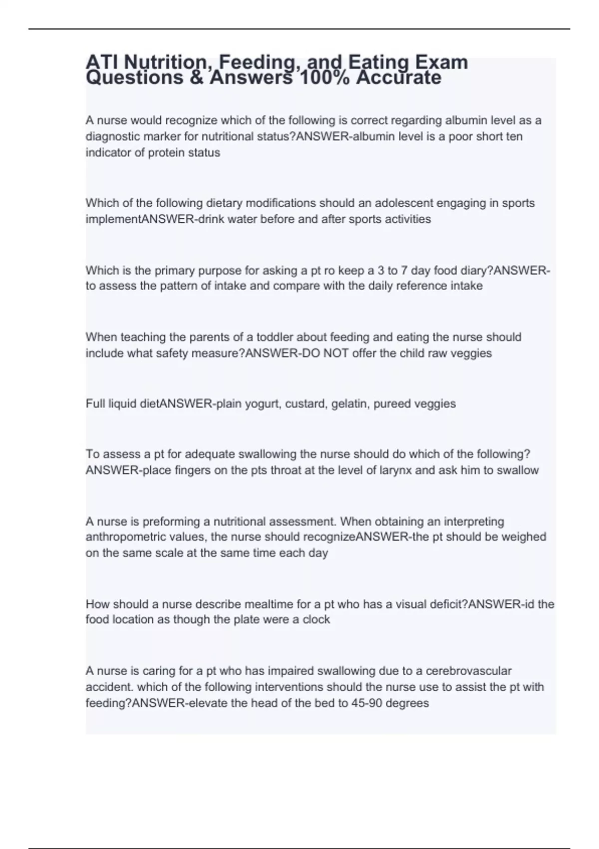 A nurse would recognize which of the following is correct regarding albumin level as a diagnostic marker for nutritional status?ANSWER-albumin level is a poor short ten indicator of protein status Which of the following dietary modifications should an adolescent engaging in sports implementANSWER-drink water before and after sports activities Which is the primary purpose for asking a pt ro keep a 3 to 7 day food diary?ANSWER-to assess the pattern of intake and compare with the daily reference intake When teaching the parents of a toddler about feeding and eating the nurse should include what safety measure?ANSWER-DO NOT offer the child raw veggies Full liquid dietANSWER-plain yogurt, custard, gelatin, pureed veggies To assess a pt for adequate swallowing the nurse should do which of the following?ANSWER-place fingers on the pts throat at the level of larynx and ask him to swallow A nurse is preforming a nutritional assessment. When obtaining an interpreting anthropometric values, the nurse should recognizeANSWER-the pt should be weighed on the same scale at the same time each day How should a nurse describe mealtime for a pt who has a visual deficit?ANSWER-id the food location as though the plate were a clock A nurse is caring for a pt who has impaired swallowing due to a cerebrovascular accident. which of the following interventions should the nurse use to assist the pt with feeding?ANSWER-elevate the head of the bed to 45-90 degrees