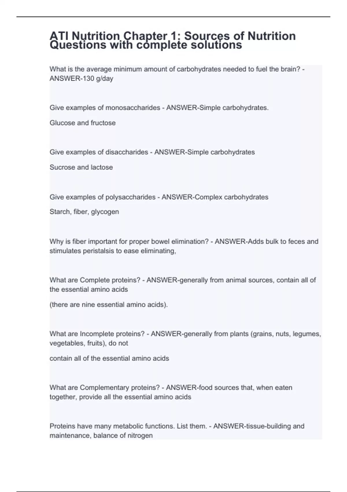 What is the average minimum amount of carbohydrates needed to fuel the brain? - ANSWER-130 g/day Give examples of monosaccharides - ANSWER-Simple carbohydrates. Glucose and fructose Give examples of disaccharides - ANSWER-Simple carbohydrates Sucrose and lactose Give examples of polysaccharides - ANSWER-Complex carbohydrates Starch, fiber, glycogen Why is fiber important for proper bowel elimination? - ANSWER-Adds bulk to feces and stimulates peristalsis to ease eliminating, What are Complete proteins? - ANSWER-generally from animal sources, contain all of the essential amino acids (there are nine essential amino acids). What are Incomplete proteins? - ANSWER-generally from plants (grains, nuts, legumes, vegetables, fruits), do not contain all of the essential amino acids What are Complementary proteins? - ANSWER-food sources that, when eaten together, provide all the essential amino acids