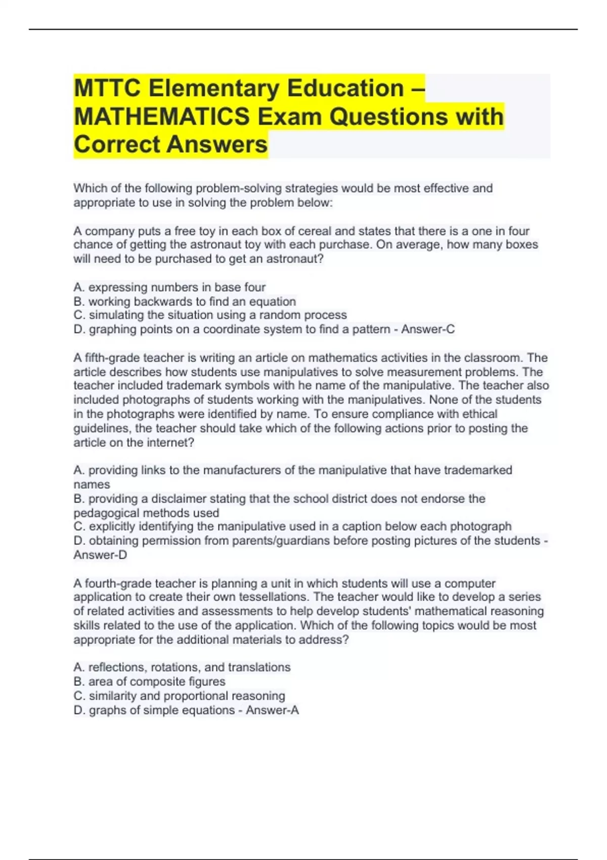 Which of the following problem-solving strategies would be most effective and appropriate to use in solving the problem below: A company puts a free toy in each box of cereal and states that there is a one in four chance of getting the astronaut toy with each purchase. On average, how many boxes will need to be purchased to get an astronaut? A. expressing numbers in base four B. working backwards to find an equation C. simulating the situation using a random process D. graphing points on a coordinate system to find a pattern - Answer-C A fifth-grade teacher is writing an article on mathematics activities in the classroom. The article describes how students use manipulatives to solve measurement problems. The teacher included trademark symbols with he name of the manipulative. The teacher also included photographs of students working with the manipulatives. None of the students in the photographs were identified by name. To ensure compliance with ethical guidelines, the teacher should take which of the following actions prior to posting the article on the internet? A. providing links to the manufacturers of the manipulative that have trademarked names B. providing a disclaimer stating that the school district does not endorse the pedagogical methods used C. explicitly identifying the manipulative used in a caption below each photograph D. obtaining permission from parents/guardians before posting pictures of the students - Answer-D A fourth-grade teacher is planning a unit in which students will use a computer application to create their own tessellations. The teacher would like to develop a series of related activities and assessments to help develop students' mathematical reasoning skills related to the use of the application. Which of the following topics would be most appropriate for the additional materials to address? A. reflections, rotations, and translations B. area of composite figures C. similarity and proportional reasoning D. graphs of simple equations - Answer-A