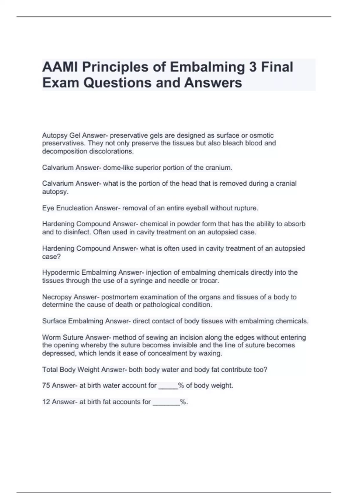 AAMI Principles of Embalming 3 Final Exam Questions and Answers