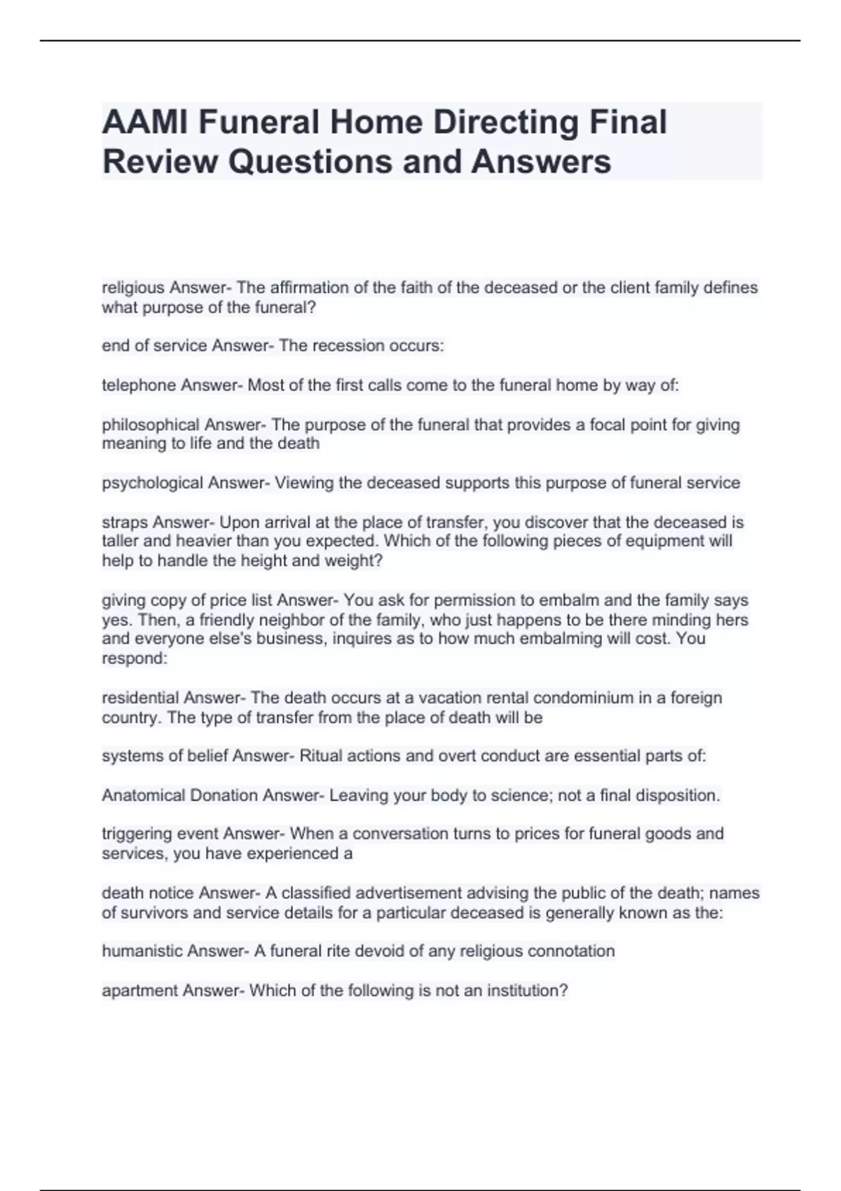 AAMI Funeral Home Directing Final Review Questions and Answers