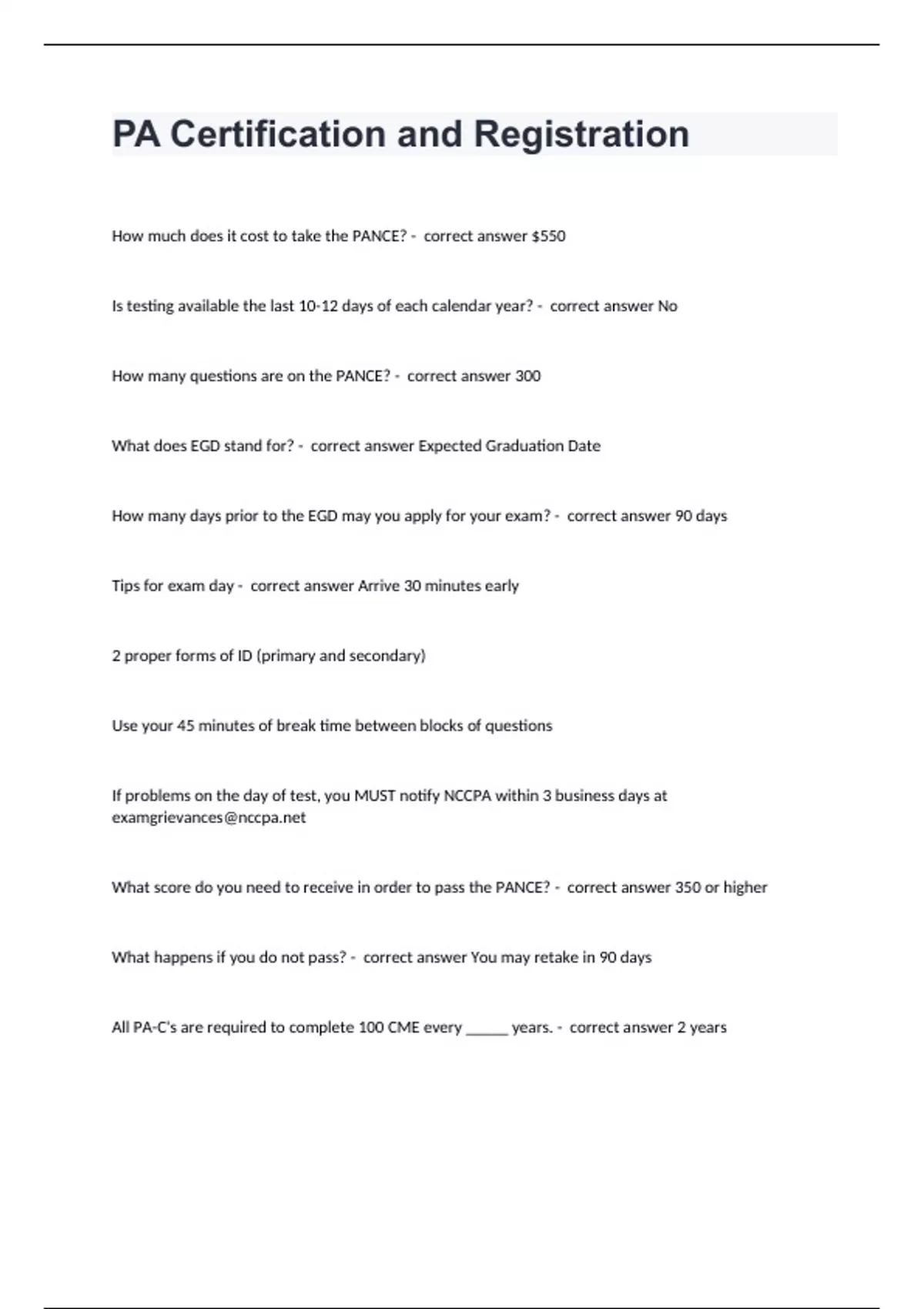 PA Certification and RegistrationHow much does it cost to take the PANCE? - correct answer $550 Is testing available the last 10-12 days of each calendar year? - correct answer No How many questions are on the PANCE? - correct answer 300 What does EGD stand for? - correct answer Expected Graduation Date How many days prior to the EGD may you apply for your exam? - correct answer 90 days Tips for exam day - correct answer Arrive 30 minutes early 2 proper forms of ID (primary and secondary) Use your 45 minutes of break time between blocks of questions If problems on the day of test, you MUST notify NCCPA within 3 business days at What score do you need to receive in order to pass the PANCE? - correct answer 350 or higher What happens if you do not pass? - correct answer You may retake in 90 days All PA-C's are required to complete 100 CME every _____ years. - correct answer 2 years