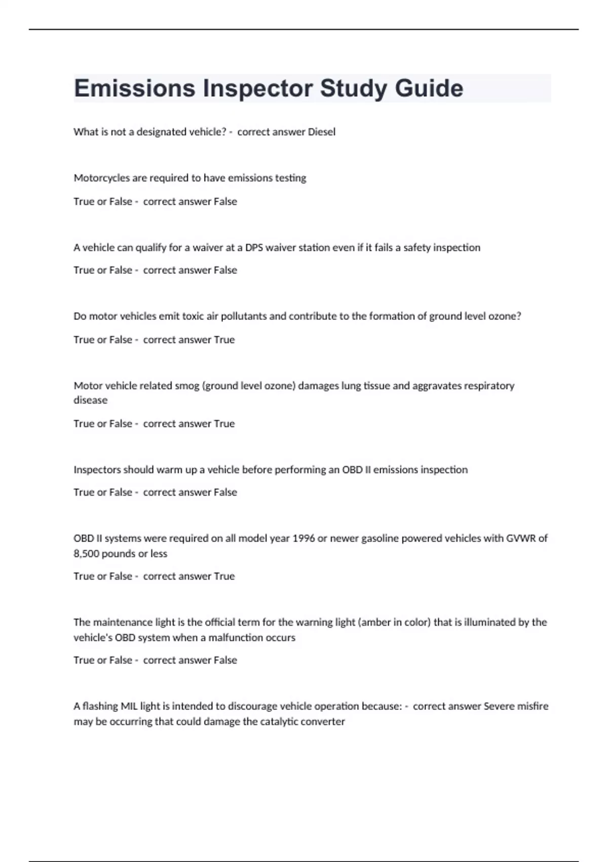 Emissions Inspector Study GuideWhat is not a designated vehicle? - correct answer Diesel Motorcycles are required to have emissions testing True or False - correct answer False A vehicle can qualify for a waiver at a DPS waiver station even if it fails a safety inspection True or False - correct answer False Do motor vehicles emit toxic air pollutants and contribute to the formation of ground level ozone? True or False - correct answer True Motor vehicle related smog (ground level ozone) damages lung tissue and aggravates respiratory disease True or False - correct answer True Inspectors should warm up a vehicle before performing an OBD II emissions inspection True or False - correct answer False OBD II systems were required on all model year 1996 or newer gasoline powered vehicles with GVWR of 8,500 pounds or less True or False - correct answer True The maintenance light is the official term for the warning light (amber in color) that is illuminated by the vehicle's OBD system when a malfunction occurs True or False - correct answer False