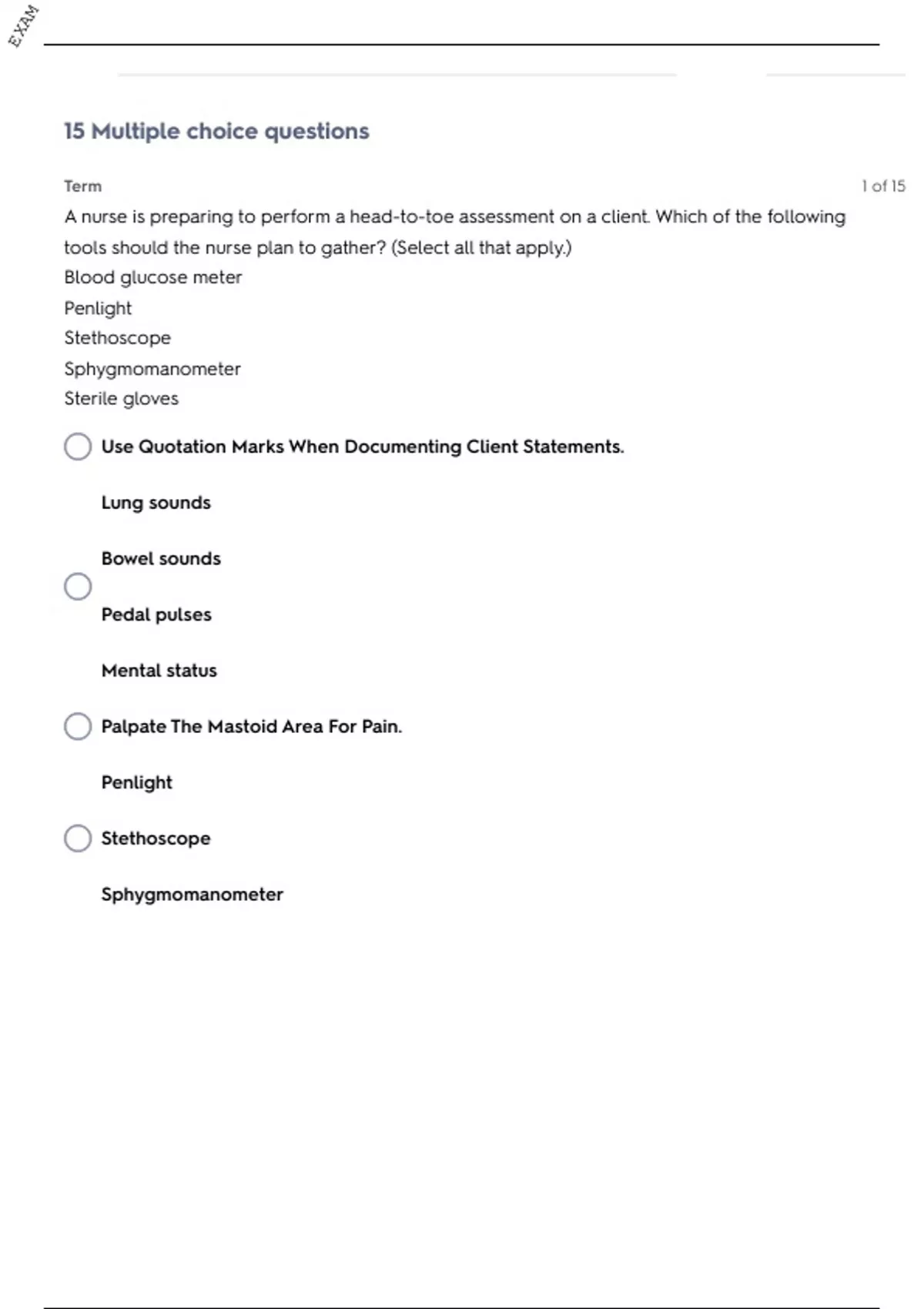 A nurse is preparing to perform a head-to-toe assessment on a client. Which of the following tools should the nurse plan to gather? (Select all that apply.) Blood glucose meter Penlight Stethoscope Sphygmomanometer Sterile gloves Use Quotation Marks When Documenting Client Statements. Lung sounds Bowel sounds Pedal pulses Mental status Palpate The Mastoid Area For Pain. Penlight Stethoscope Sphygmomanometer 1 of 15 EXAM Term A nurse in an outpatient setting is performing a head-to-toe assessment on a client. Which of the following should be nurse inspect when performing a general survey of the client? (Select all that apply.) Nutritional status Hygiene Lung expansion Posture Range-of-motion Distended veins in one breast Regularity of the pulse Strength of the pulse Characteristics of The Respirations Nutritional status Hygiene Posture 2 of 15 EXAM Term A nurse is preparing to conduct a head-to-toe assessment on a client in an outpatient setting. At which of the following times should the nurse plan to collect information about the client's general appearance? (Select all that apply.) During an interview about the client's health history When introducing themselves to the client Once the focused assessments have been completed While collecting the client's vital signs During the discussion of planning for follow-up care Inspect the condition of each fingernail. Compare the amplitude of the radial pulses bilaterally. Palpate the shoulder, elbow, wrist, and finger joints. Instruct the client to swallow. Apply downward pressure and ask the client to shrug their shoulders. Request the client move their head forward and backward and then side to side. Lung sounds Bowel sounds Pedal pulses Mental status During an interview about the client's health history When introducing themselves to the client While collecting the client's vital signs