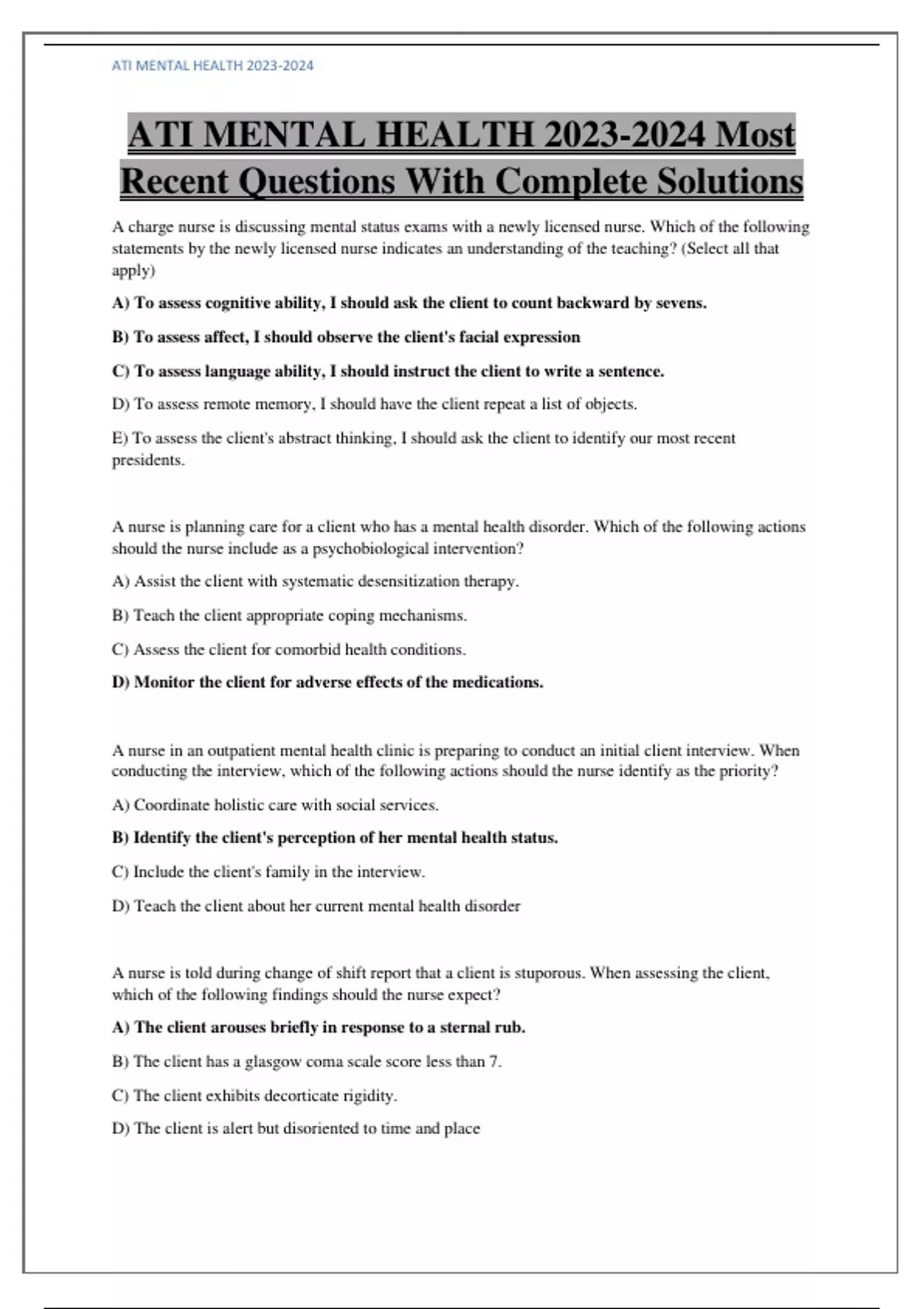 ATI MENTAL HEALTH Most Recent Questions With Complete Solutions