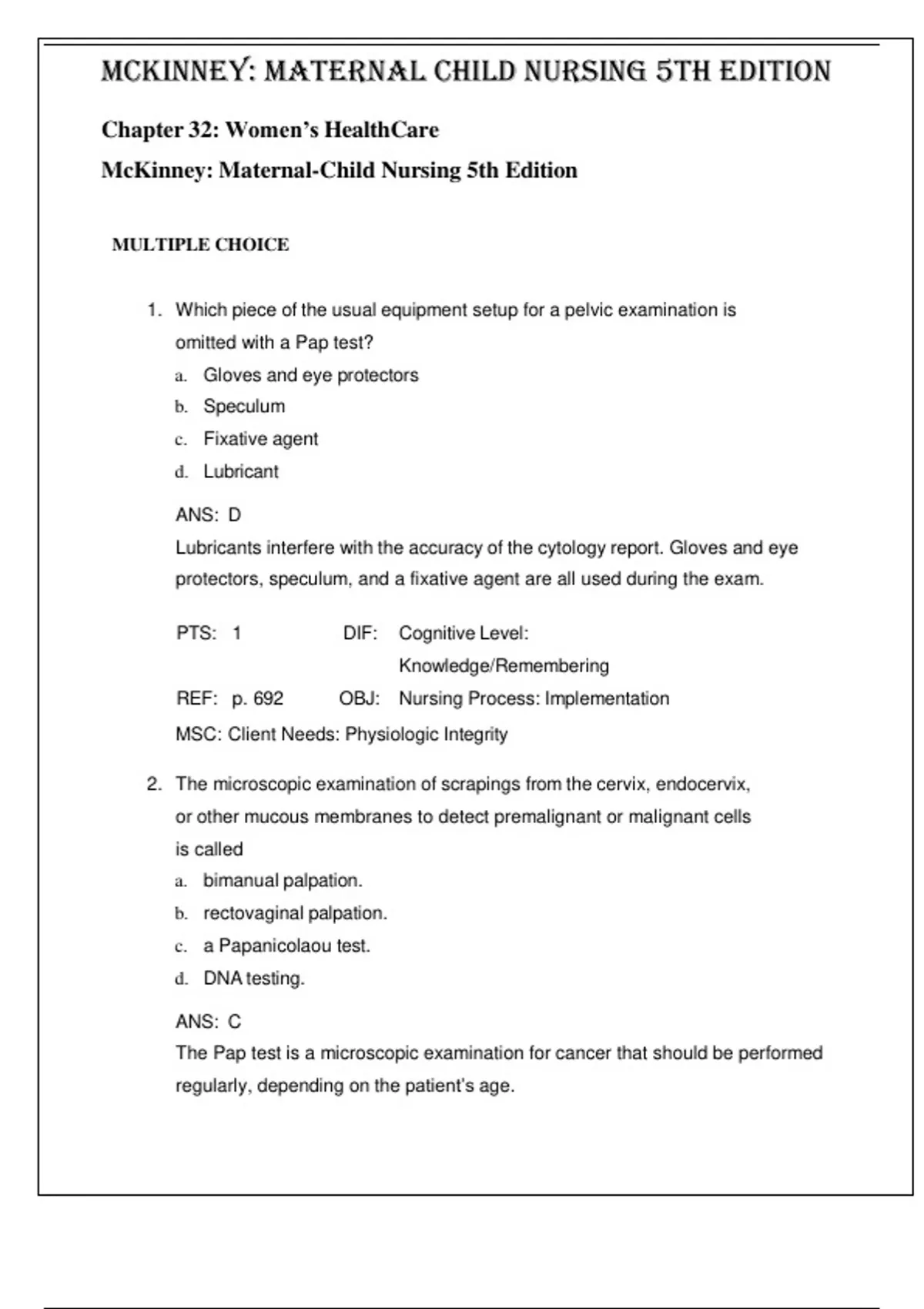 Maternal Child Nursing 5th Edition by McKinney- ISBN- 978-0323401708 TEST BANK Chapter 32: Women’s Health Care Verified 2024 Practice Questions and 100% Correct Answers with Explanations for Exam Preparation, Graded A+ Which piece of the usual equipment setup for a pelvic examination is omitted with a Pap test? a. Gloves and eye protectors b. Speculum c. Fixative agent d. Lubricant ANS: D Lubricants interfere with the accuracy of the cytology report. Gloves and eye protectors, speculum, and a fixative agent are all used during the exam. PTS: 1 DIF: Cognitive Level: Knowledge/Remembering REF: p. 692 OBJ: Nursing Process: Implementation MSC: Client Needs: Physiologic Integrity 2. The microscopic examination of scrapings from the cervix, endocervix, or other mucous membranes to detect premalignant or malignant cells is called a. bimanual palpation. b. rectovaginal palpation. c. a Papanicolaou test. d. DNA testing. ANS: C The Pap test is a microscopic examination for cancer that should be performed regularly, depending on the patient’s age. Bimanual palpation is a physical examination of the vagina, rectovaginal palpation is a physical examination performed through the rectum, and DNA testing for the various types of HPV that cause cervical cancer is now available. Samples are collected in the same way as a Pap test. PTS: 1 DIF: Cognitive Level: Knowledge/Remembering REF: p. 692 OBJ: Nursing Process: Implementation MSC: Client Needs: Physiologic Integrity