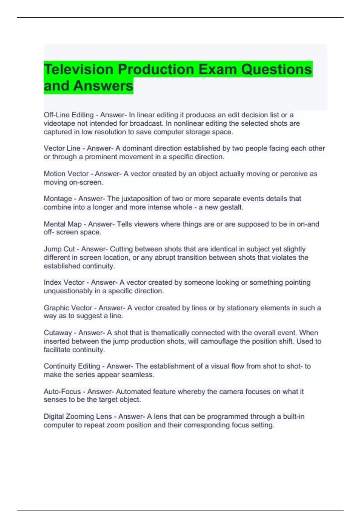 Television Production Exam Questions and Answers 2024