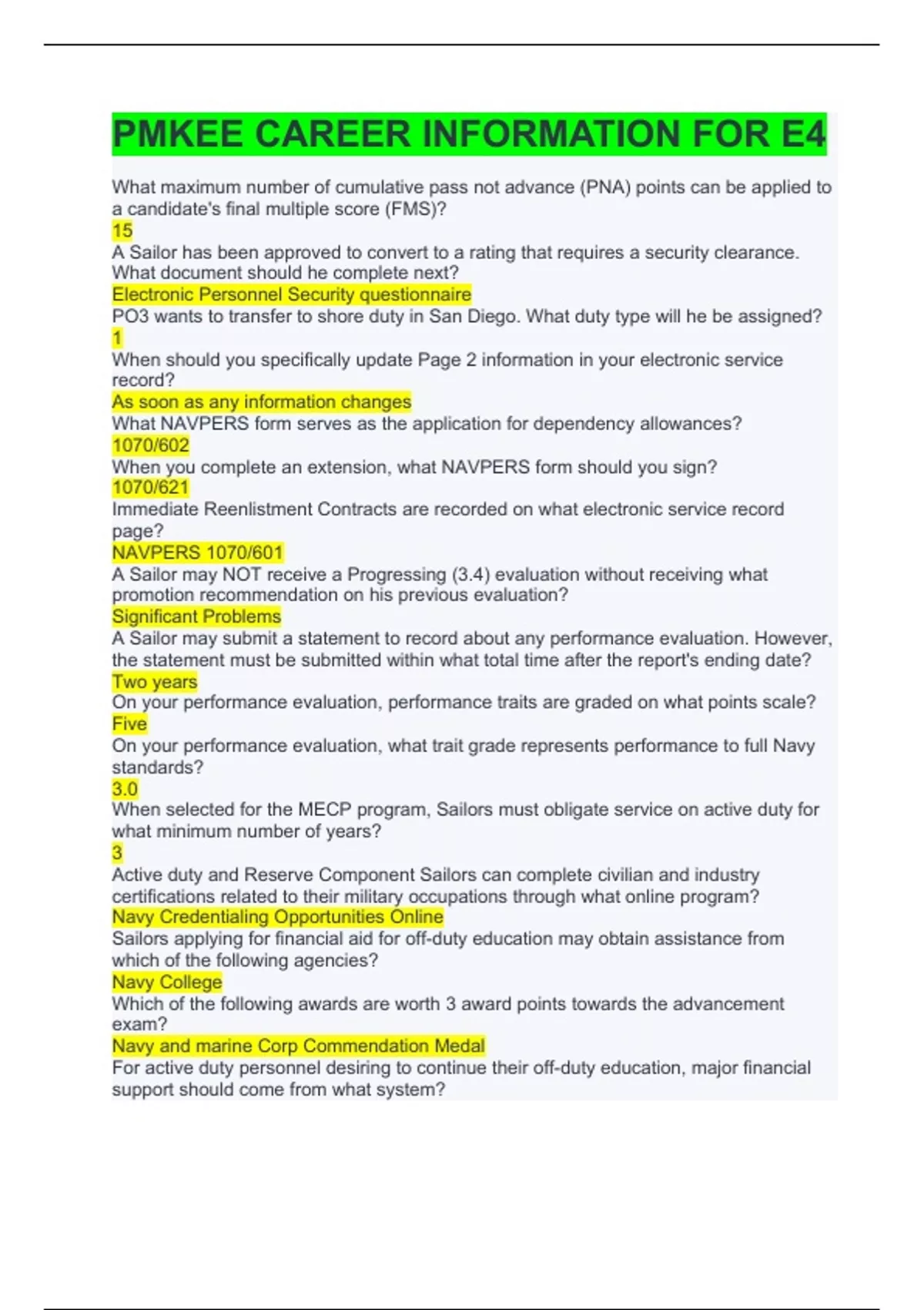 PMKEE CAREER INFORMATION FOR E4 What maximum number of cumulative pass not advance (PNA) points can be applied to a candidate's final multiple score (FMS)? 15 A Sailor has been approved to convert to a rating that requires a security clearance. What document should he complete next? Electronic Personnel Security questionnaire PO3 wants to transfer to shore duty in San Diego. What duty type will he be assigned? 1 When should you specifically update Page 2 information in your electronic service record? As soon as any information changes What NAVPERS form serves as the application for dependency allowances? 1070/602 When you complete an extension, what NAVPERS form should you sign? 1070/621 Immediate Reenlistment Contracts are recorded on what electronic service record page? NAVPERS 1070/601 A Sailor may NOT receive a Progressing (3.4) evaluation without receiving what promotion recommendation on his previous evaluation? Significant Problems A Sailor may submit a statement to record about any performance evaluation. However, the statement must be submitted within what total time after the report's ending date? Two years On your performance evaluation, performance traits are graded on what points scale? Five On your performance evaluation, what trait grade represents performance to full Navy standards? 3.0 When selected for the MECP program, Sailors must obligate service on active duty for what minimum number of years? 3 Active duty and Reserve Component Sailors can complete civilian and industry certifications related to their military occupations through what online program? Navy Credentialing Opportunities Online Sailors applying for financial aid for off-duty education may obtain assistance from which of the following agencies? Navy College Which of the following awards are worth 3 award points towards the advancement exam? Navy and marine Corp Commendation Medal For active duty personnel desiring to continue their off-duty education, major financial support should come from what system?