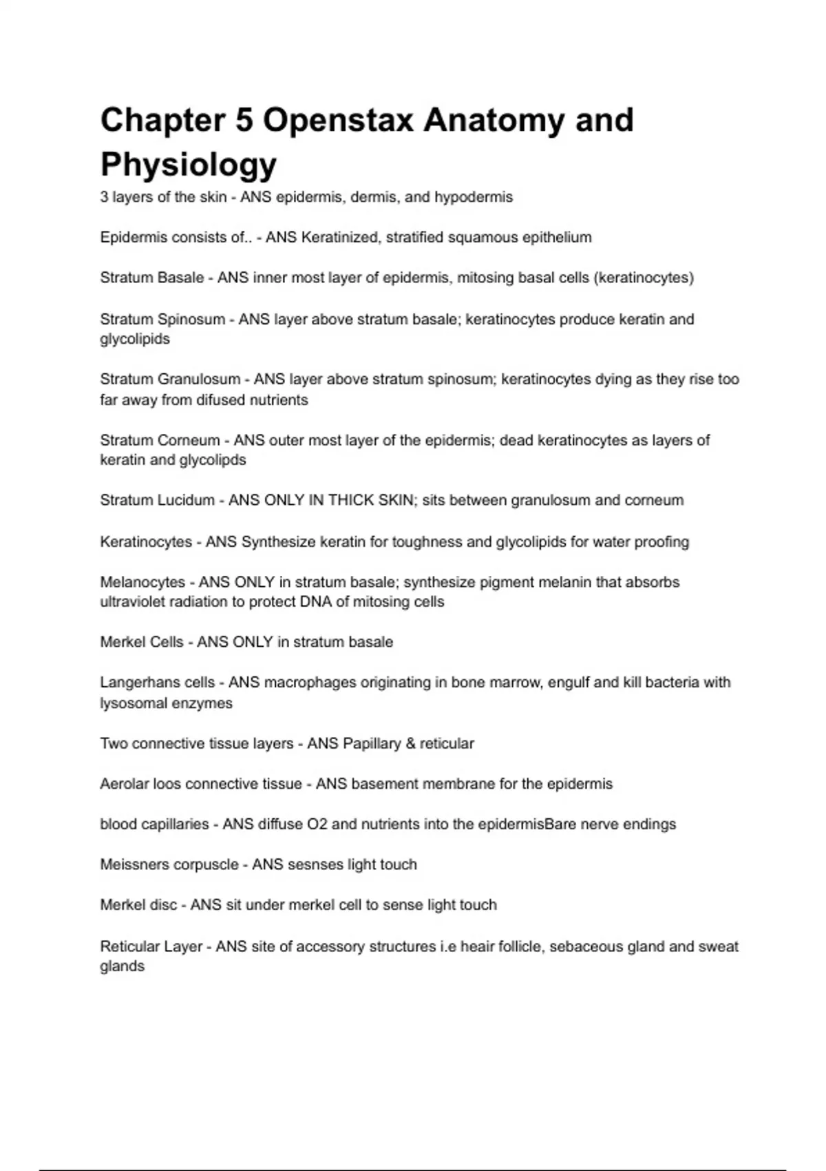 Chapter 5 Openstax Anatomy and Physiology 3 layers of the skin - ANS epidermis, dermis, and hypodermis Epidermis consists of.. - ANS Keratinized, stratified squamous epithelium Stratum Basale - ANS inner most layer of epidermis, mitosing basal cells (keratinocytes) Stratum Spinosum - ANS layer above stratum basale; keratinocytes produce keratin and glycolipids Stratum Granulosum - ANS layer above stratum spinosum; keratinocytes dying as they rise too far away from difused nutrients Stratum Corneum - ANS outer most layer of the epidermis; dead keratinocytes as layers of keratin and glycolipds Stratum Lucidum - ANS ONLY IN THICK SKIN; sits between granulosum and corneum Keratinocytes - ANS Synthesize keratin for toughness and glycolipids for water proofing Melanocytes - ANS ONLY in stratum basale; synthesize pigment melanin that absorbs ultraviolet radiation to protect DNA of mitosing cells Merkel Cells - ANS ONLY in stratum basale Langerhans cells - ANS macrophages originating in bone marrow, engulf and kill bacteria with lysosomal enzymes Two connective tissue layers - ANS Papillary & reticular Aerolar loos connective tissue - ANS basement membrane for the epidermis blood capillaries - ANS diffuse O2 and nutrients into the epidermisBare nerve endings Meissners corpuscle - ANS sesnses light touch Merkel disc - ANS sit under merkel cell to sense light touch Reticular Layer - ANS site of accessory structures i.e heair follicle, sebaceous gland and sweat glands Hypodermis - ANS connects skin to underlying bones and muscles Subcutaneous Fat - ANS Adipose- for shock absorption, thermal insulation, energy storage.