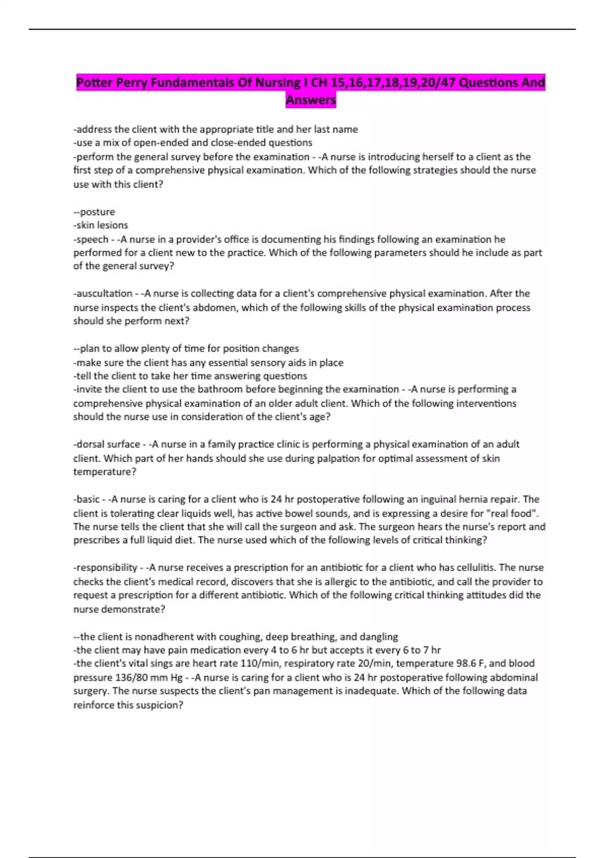 Potter Perry Fundamentals Of Nursing I CH 15,16,17,18,19,20/47 Questions And Answers