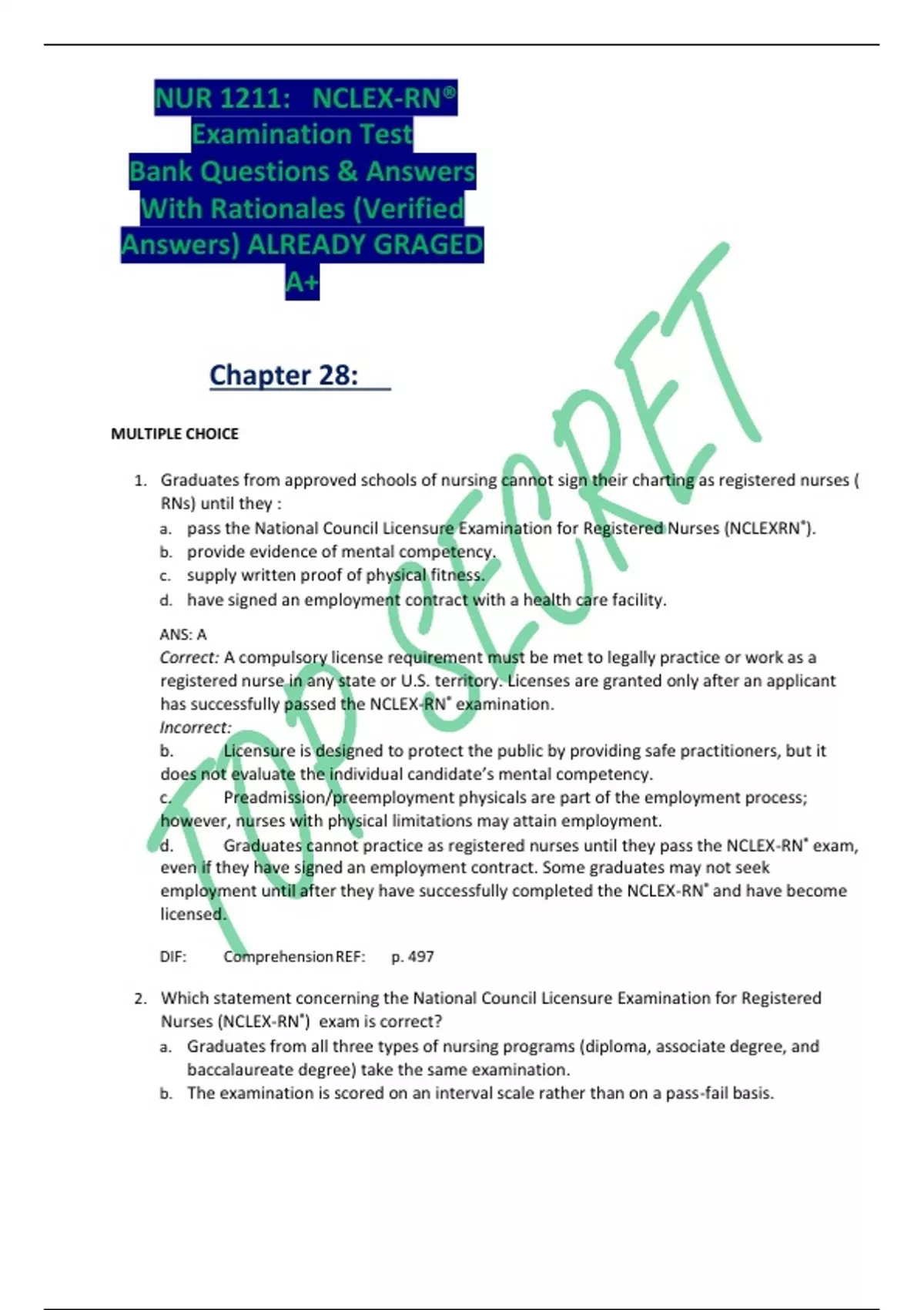 NUR 1211; NCLEX-RN EXAMINATION TEST BANK QUESTIONS & ANSWERS WITH RATIONALES (VERIFIED ANSWERS) ALREADY GRADED A+
