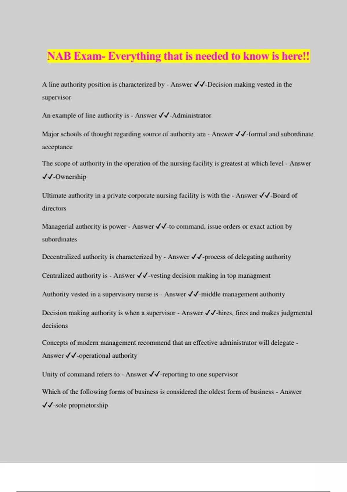 NAB Exam- Everything that is needed to know is here!! A line authority position is characterized by - Answer ️️ -Decision making vested in the supervisor An example of line authority is - Answer ️️ -Administrator Major schools of thought regarding source of authority are - Answer ️️ -formal and subordinate acceptance The scope of authority in the operation of the nursing facility is greatest at which level - Answer ️️ -Ownership Ultimate authority in a private corporate nursing facility is with the - Answer ️️ -Board of directors Managerial authority is power - Answer ️️ -to command, issue orders or exact action by subordinates Decentralized authority is characterized by - Answer ️️ -process of delegating authority Centralized authority is - Answer ️️ -vesting decision making in top managment Authority vested in a supervisory nurse is - Answer ️️ -middle management authority Decision making authority is when a supervisor - Answer ️️ -hires, fires and makes judgmental decisions Concepts of modern management recommend that an effective administrator will delegate - Answer ️️ -operational authority Unity of command refers to - Answer ️️ -reporting to one supervisor Which of the following forms of business is considered the oldest form of business - Answer ️️ -sole proprietorship The term proprietorship as it relates to the nursing facility industry means - Answer ️️ - privately owned The majority of nursing facility beds in the united states are owned by - Answer ️️ - corporations Which of the following forms of ownership must have articles drawn up and reduced to writing? - Answer ️️ -corporation Under which form of ownership would the administrator have the greatest latitude of authority and decision making? - Answer ️️ -Sole proprietorship All but one are considered advantages of sole proprietorship - Answer ️️ -Unlimited liability All but one are considered disadvantages of a partnership - Answer ️️ -Retention of valuable employees A corporation is - Answer ️️ -a legal entity created by law to carry on a business or profession Which one of the following forms of business ownership is considered the most important? - Answer ️️ -Corporation A nonprofit corporation is one which - Answer ️️ -makes a profit but returns it to the operation of business Pursuant to the Code of Federal Regulations, 42 CFR part 483, a facility wishing to participate in medicare must have - Answer ️️ -a governing body The role of the governing body pursuant to the Code of Federal Regulation 42 CFR Part 483 is to - Answer ️️ -establish and implement policies regarding management and operation of the facility The Code of Federal Regulations 42 CFR part 483 requires that the facility disclose - Answer ️️ -officers, directors, agents, or management employees The role of the administrator in a modern nursing facility is to - Answer ️️ -advise the governing body and carry out their decisions According to the Code of Federal Regulations 42 CFR Part 483 the administrator appointed by the governing body must be - Answer ️️ -licensed by the state and responsible for the management of the facility An objective may be defined as - Answer ️️ -organizing The first step in planning is - Answer ️️ -setting the objectives of the organization Effective management is best carried out by following which method? - Answer ️️ - management by objectives Management by objectives involves - Answer ️️ -plurality of objectives Which of the following objectives would be considered first in establishing a new nursing facility? - Answer ️️ -Type of facility An administrator of a proprietary nursing facility should be primarily concerned with which one of the following objectives? - Answer ️️ -Quality of care Which one of the functions of management would be accomplished first? - Answer ️️ -planning Relative to setting objectives, which task listed below would be of primary importance for the administrator to accomplish? - Answer ️️ -constantly review and reassess objectives of the nursing facility Which one of the following statements is true? - Answer ️️ -Every department in the nursing facility should have goals or objectives Since there is a plurality of objectives in a nursing facility, the facility should concern itself with - Answer ️️ -long and short term goals Planning is primarily concerned with - Answer ️️ -use of facts to determine course of action for the future Strategic planning - Answer ️️ -helps the facility to re evaluate its mission and identify its long term goals. Planning on a broad scale is carried on primarily by a - Answer ️️ -administrator Planning involves all but one of the following - Answer ️️ -personnel decisions Which of the following is not a function of the administrator? - Answer ️️ -ultimate approval of all policies (governing board does that) Planning at the top level of management is best characterized as - Answer ️️ -broad, far- reaching, and basic In the process of planning, which guideline should be followed? - Answer ️️ -involve as many managers as possible Considering the functions of management such as: directing, organizing, coordination, controlling and planning, which of these functions would be first? - Answer ️️ -planning The technique of forecasting is important in the modern nursing facility. The accuracy of the administrator's forecasts will affect the success of planning. Forecasts are expected to be - Answer ️️ -a reasonable estimate of what reality will be in the future In the process of planning, the administrator should - Answer ️️ -constantly check, recheck, and modify the plan if necessarry A short range plan covers which time period? - Answer ️️ -1-2 years A long range plan covers - Answer ️️ -3-5 years The function of management called organizing is best described as - Answer ️️ -the proce