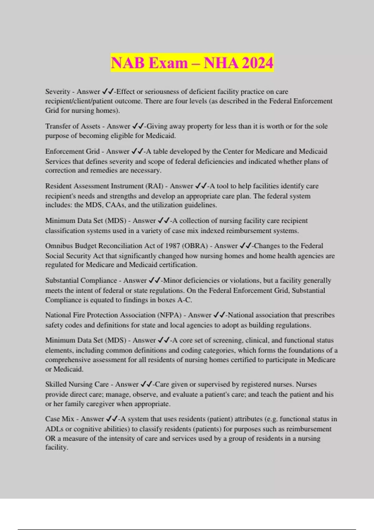 NAB Exam – NHA 2024 Severity - Answer ️️ -Effect or seriousness of deficient facility practice on care recipient/client/patient outcome. There are four levels (as described in the Federal Enforcement Grid for nursing homes). Transfer of Assets - Answer ️️ -Giving away property for less than it is worth or for the sole purpose of becoming eligible for Medicaid. Enforcement Grid - Answer ️️ -A table developed by the Center for Medicare and Medicaid Services that defines severity and scope of federal deficiencies and indicated whether plans of correction and remedies are necessary. Resident Assessment Instrument (RAI) - Answer ️️ -A tool to help facilities identify care recipient's needs and strengths and develop an appropriate care plan. The federal system includes: the MDS, CAAs, and the utilization guidelines. Minimum Data Set (MDS) - Answer ️️ -A collection of nursing facility care recipient classification systems used in a variety of case mix indexed reimbursement systems. Omnibus Budget Reconciliation Act of 1987 (OBRA) - Answer ️️ -Changes to the Federal Social Security Act that significantly changed how nursing homes and home health agencies are regulated for Medicare and Medicaid certification. Substantial Compliance - Answer ️️ -Minor deficiencies or violations, but a facility generally meets the intent of federal or state regulations. On the Federal Enforcement Grid, Substantial Compliance is equated to findings in boxes A-C