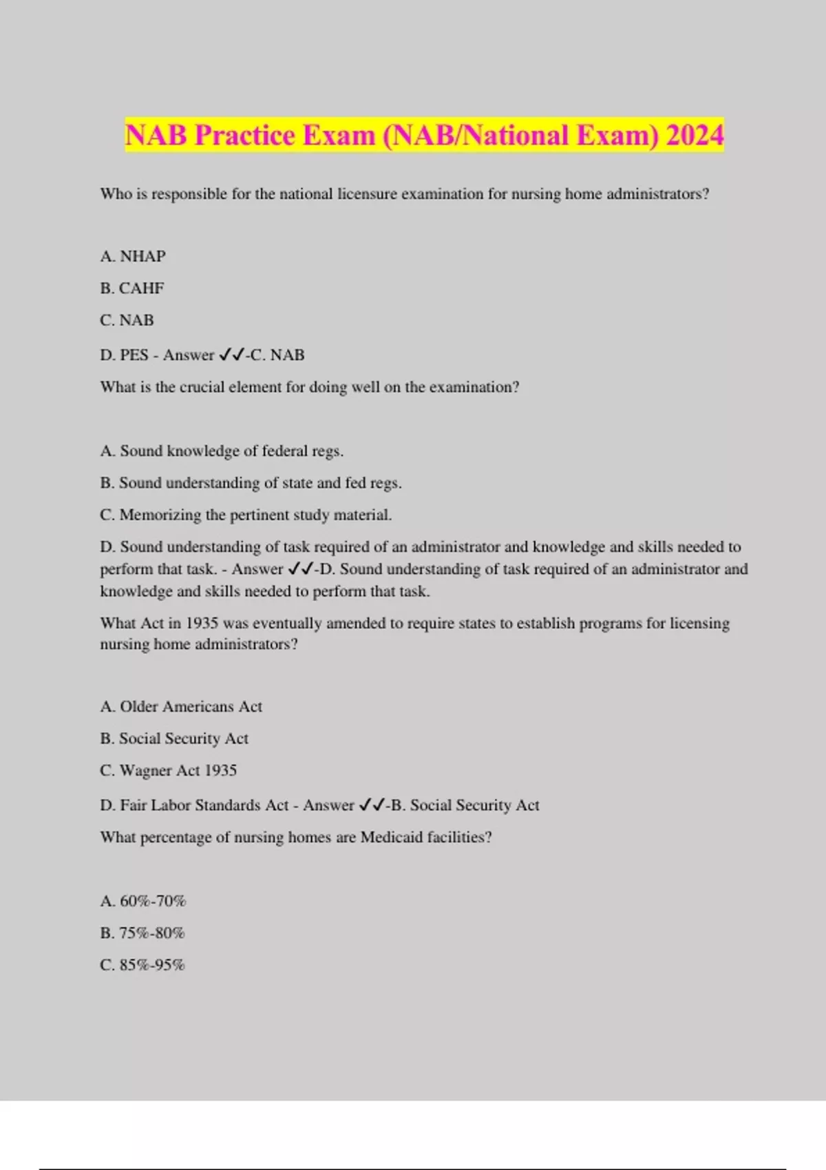 NAB Practice Exam (NAB/National Exam) 2024 Who is responsible for the national licensure examination for nursing home administrators? A. NHAP B. CAHF C. NAB D. PES - Answer ️️ -C. NAB What is the crucial element for doing well on the examination? A. Sound knowledge of federal regs. B. Sound understanding of state and fed regs. C. Memorizing the pertinent study material. D. Sound understanding of task required of an administrator and knowledge and skills needed to perform that task. - Answer ️️ -D. Sound understanding of task required of an administrator and knowledge and skills needed to perform that task. What Act in 1935 was eventually amended to require states to establish programs for licensing nursing home administrators? A. Older Americans Act B. Social Security Act C. Wagner Act 1935 D. Fair Labor Standards Act - Answer ️️ -B. Social Security Act What percentage of nursing homes are Medicaid facilities? A. 60%-70% B. 75%-80% C. 85%-95% D. 40%-50% - Answer ️️ -B. 75%-80% The field of study that examines the economic, social and psychological aspects of aging is called what? A. Psychology B. Gerontology C. Psychiatry D. Geriatrics - Answer ️️ -B. Gerontology The professional designation of those that specialize in the diagnosis, management and prevention of disease and chronic illness of the elderly population is know as what? A. Psychology B. Gerontology C. Psychiatry D. Geriatrics - Answer ️️ -D. Geriatrics A discrimination of prejudice action towards a person because of age is known as what? A. Passing judgement B. Ageism C. Inappropriate D. New Ageism - Answer ️️ -B. Ageism Staff having tendency to patronize the elderly and be overly solicitous towards them is most descriptive of what? A. Passing judgement B. Ageism C. Inappropriate D. New Ageism - Answer ️️ -D. New Ageism What are the dimensions of aging viewed by gerontologists? A. Mental, physical, emotional B. Social, psychological, biological, chronological C. Psychological, biological, chronological D. Social, biological, chronological - Answer ️️ -B. Social, psychological, biological, chronilogical What is the fastest growing older population? A. Young - old (65-74) B. Old - old (75-84) C. Oldest - old (85 and over) D. Young - young (55-64) - Answer ️️ -C. Oldest - old (85 and over) Why are there more women then men in nursing facilities? A. Genes and DNA B. Longer life expectancy and lack of spouse as a care giver C. Better health habits D. Lower rate of heart disease - Answer ️️ -B. Longer life expectancy and lack of spouse as a care giver - Answer ️️ -C - Answer ️️ -D - Answer ️️ -C - Answer ️️ -A - Answer ️️ -C - Answer ️️ -B - Answer ️️ -D - Answer ️️ -D - Answer ️️ -A