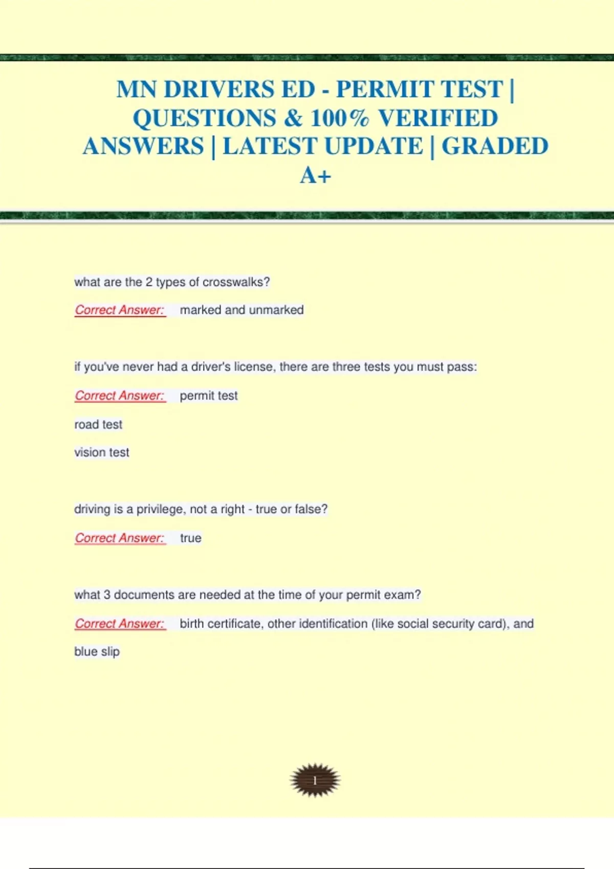 MN DRIVERS ED - PERMIT TEST | QUESTIONS & 100% VERIFIED ANSWERS | LATEST UPDATE | GRADED A+ MN DRIVERS ED - PERMIT TEST | QUESTIONS & 100% VERIFIED ANSWERS | LATEST UPDATE | GRADED A+