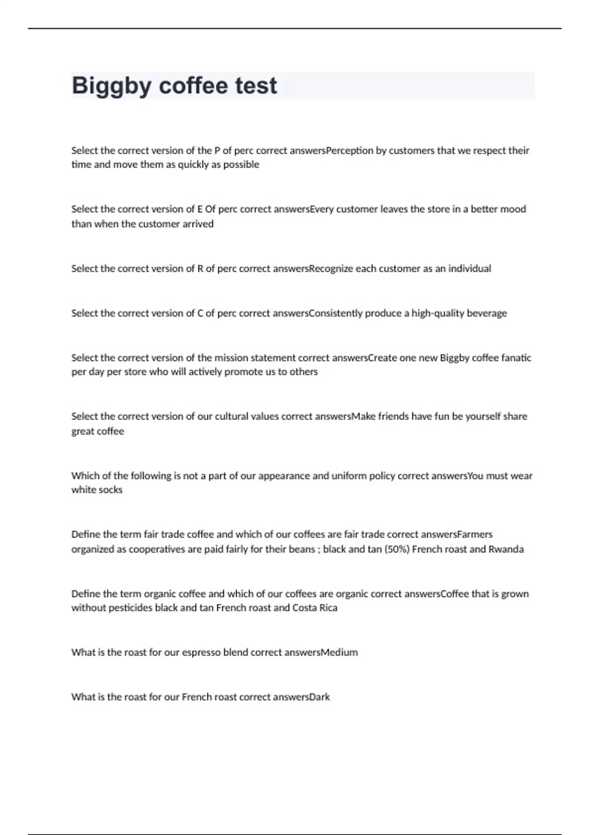 Select the correct version of the P of perc correct answersPerception by customers that we respect their time and move them as quickly as possible Select the correct version of E Of perc correct answersEvery customer leaves the store in a better mood than when the customer arrived Select the correct version of R of perc correct answersRecognize each customer as an individual Select the correct version of C of perc correct answersConsistently produce a high-quality beverage Select the correct version of the mission statement correct answersCreate one new Biggby coffee fanatic per day per store who will actively promote us to others Select the correct version of our cultural values correct answersMake friends have fun be yourself share great coffee Which of the following is not a part of our appearance and uniform policy correct answersYou must wear white socks Define the term fair trade coffee and which of our coffees are fair trade correct answersFarmers organized as cooperatives are paid fairly for their beans ; black and tan (50%) French roast and Rwanda Define the term organic coffee and which of our coffees are organic correct answersCoffee that is grown without pesticides black and tan French roast and Costa Rica What is the roast for our espresso blend correct answersMedium What is the roast for our French roast correct answersDark