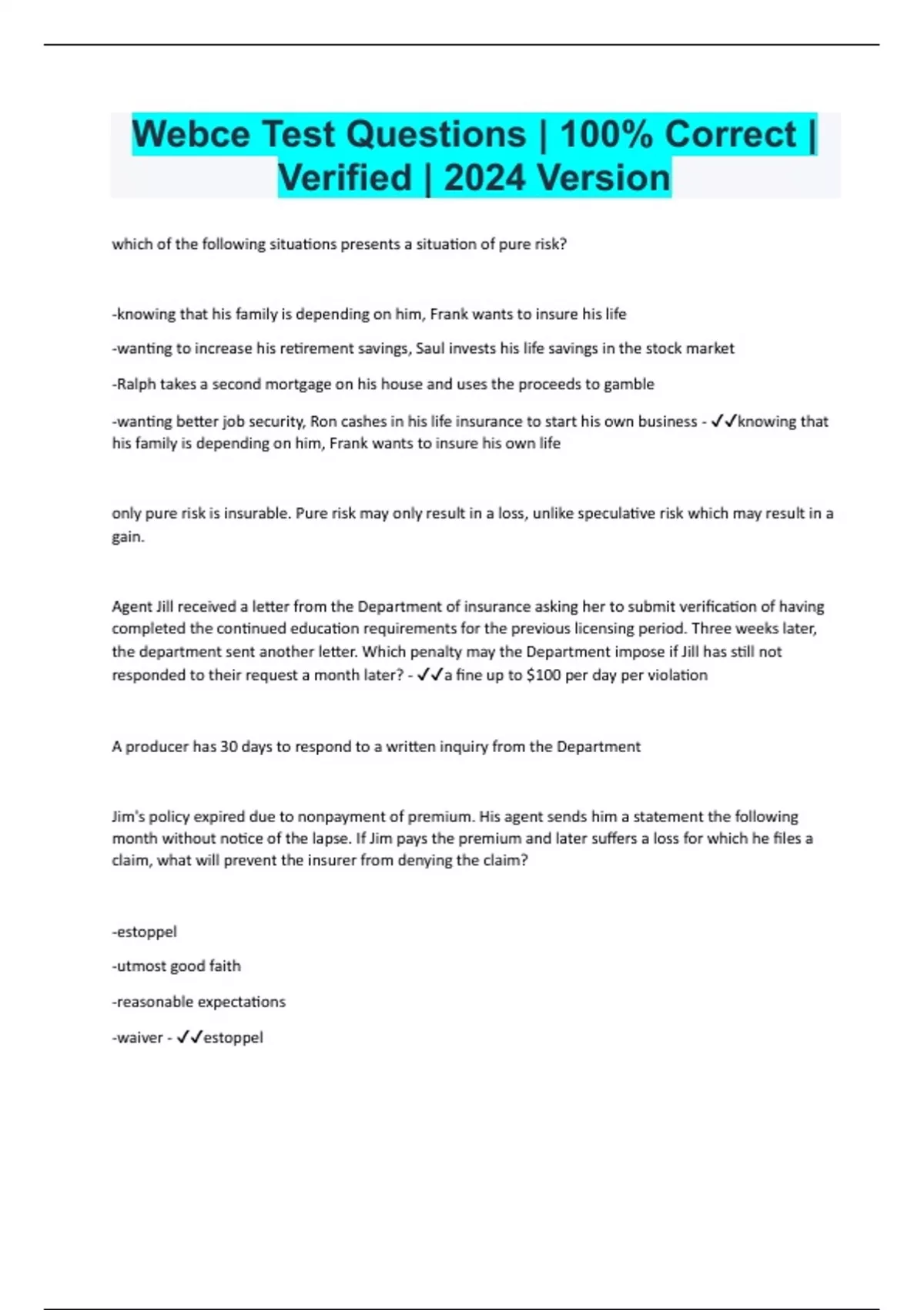 which of the following situations presents a situation of pure risk? -knowing that his family is depending on him, Frank wants to insure his life -wanting to increase his retirement savings, Saul invests his life savings in the stock market -Ralph takes a second mortgage on his house and uses the proceeds to gamble -wanting better job security, Ron cashes in his life insurance to start his own business - knowing that his family is depending on him, Frank wants to insure his own life only pure risk is insurable. Pure risk may only result in a loss, unlike speculative risk which may result in a gain. Agent Jill received a letter from the Department of insurance asking her to submit verification of having completed the continued education requirements for the previous licensing period. Three weeks later, the department sent another letter. Which penalty may the Department impose if Jill has still not responded to their request a month later? - a fine up to $100 per day per violation A producer has 30 days to respond to a written inquiry from the Department Jim's policy expired due to nonpayment of premium. His agent sends him a statement the following month without notice of the lapse. If Jim pays the premium and later suffers a loss for which he files a claim, what will prevent the insurer from denying the claim? -estoppel -utmost good faith -reasonable expectations -waiver - estoppel