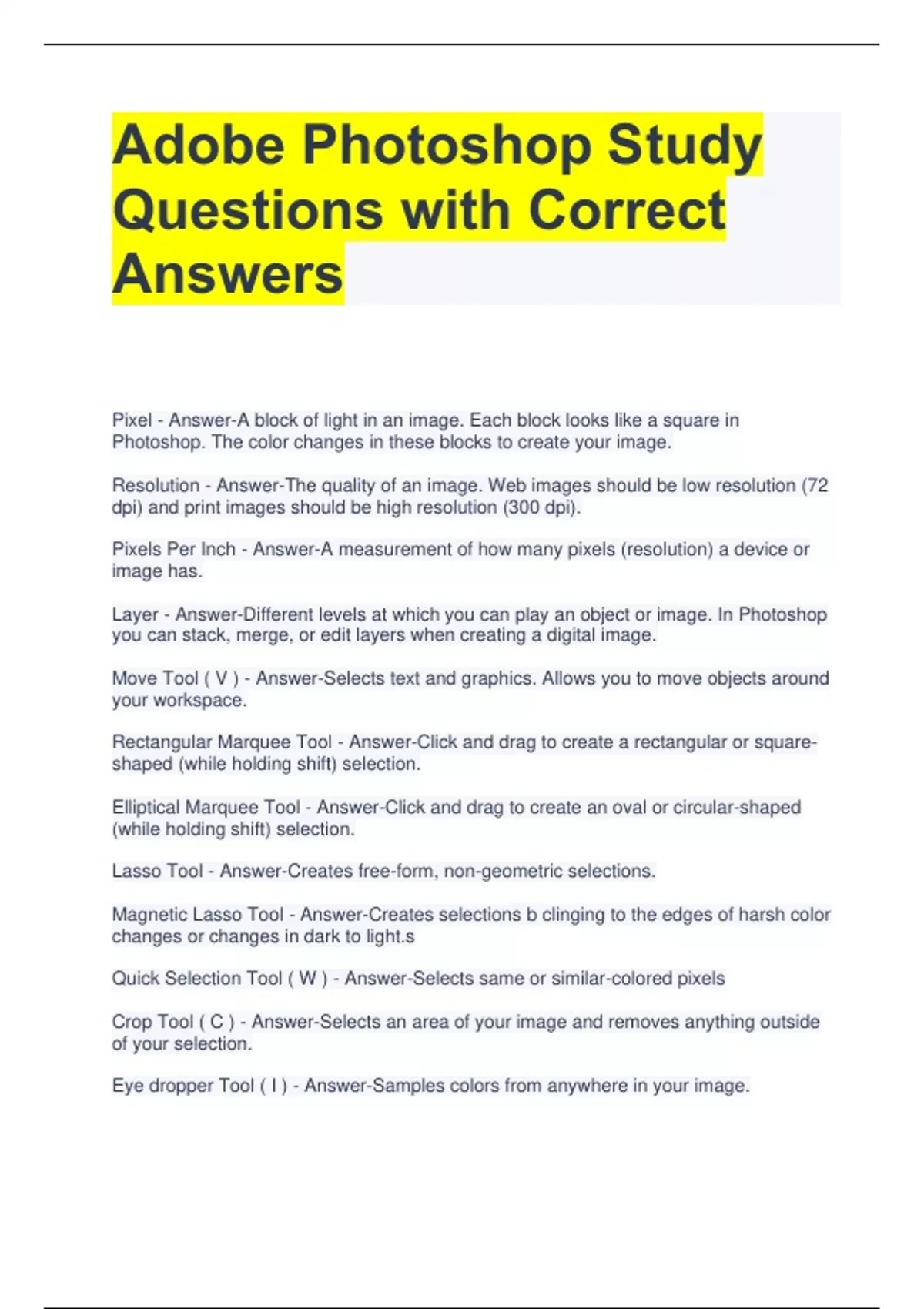 Adobe Photoshop Study Questions with Correct Answers Pixel - Answer-A block of light in an image. Each block looks like a square in Photoshop. The color changes in these blocks to create your image. Resolution - Answer-The quality of an image. Web images should be low resolution (72 dpi) and print images should be high resolution (300 dpi). Pixels Per Inch - Answer-A measurement of how many pixels (resolution) a device or image has. Layer - Answer-Different levels at which you can play an object or image. In Photoshop you can stack, merge, or edit layers when creating a digital image. Move Tool ( V ) - Answer-Selects text and graphics. Allows you to move objects around your workspace. Rectangular Marquee Tool - Answer-Click and drag to create a rectangular or squareshaped (while holding shift) selection.