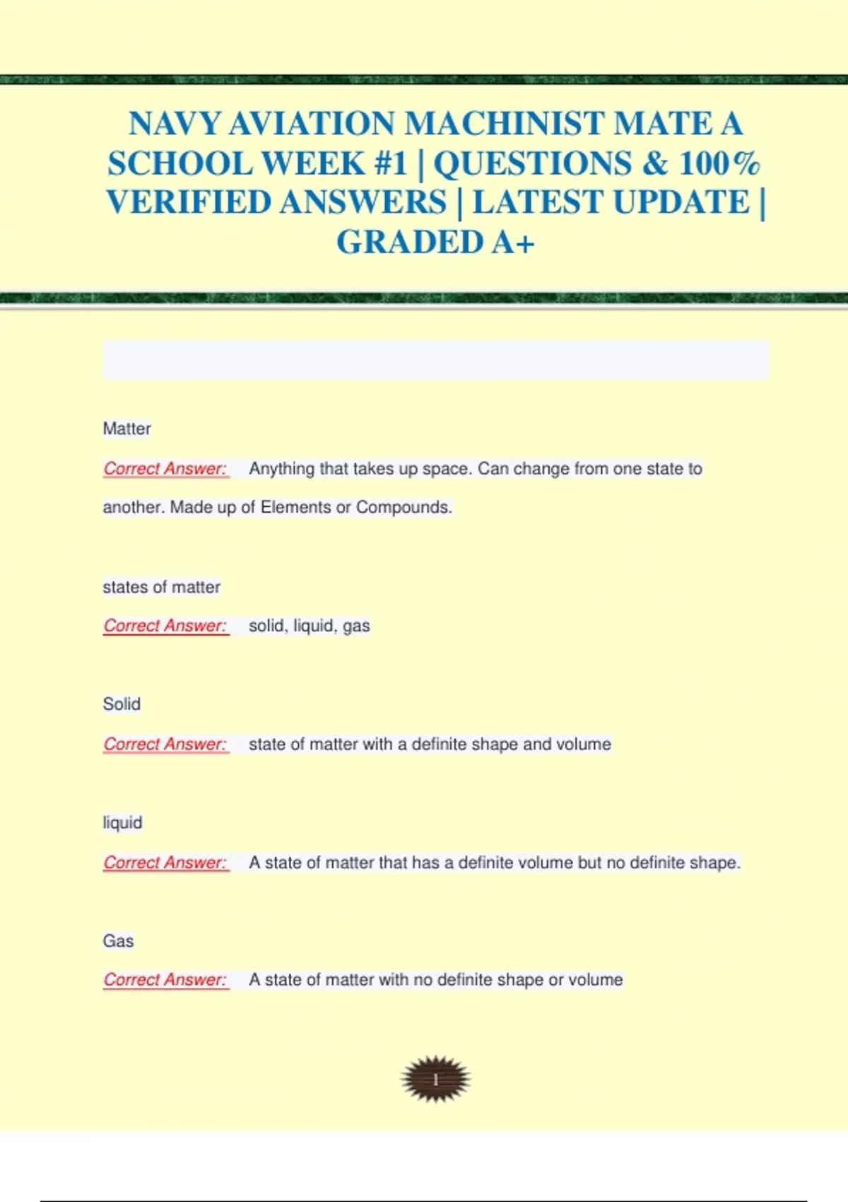 NAVY AVIATION MACHINIST MATE A SCHOOL WEEK #1 | QUESTIONS & 100% VERIFIED ANSWERS | LATEST UPDATE | GRADED A+ NAVY AVIATION MACHINIST MATE A SCHOOL WEEK #1 | QUESTIONS & 100% VERIFIED ANSWERS | LATEST UPDATE | GRADED A+