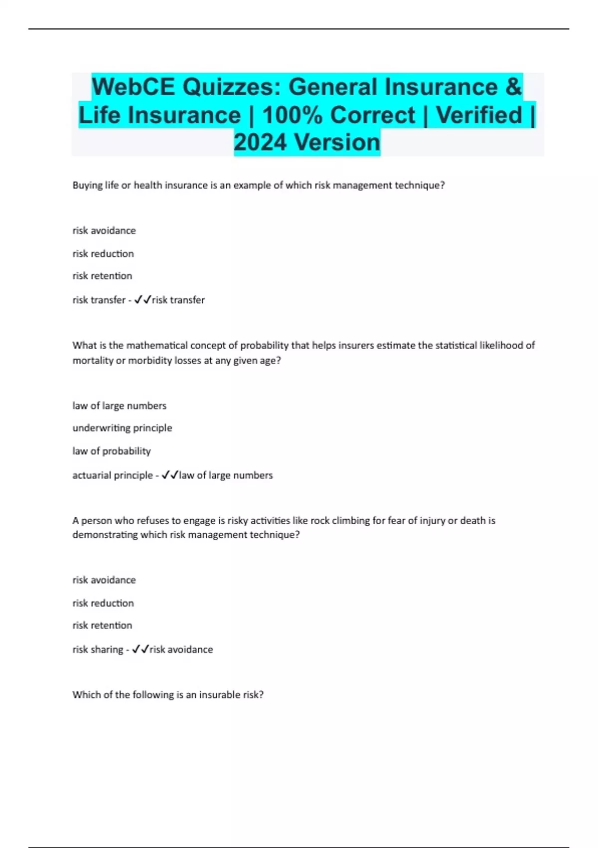 WebCE Quizzes: General Insurance & Life Insurance | 100% Correct | Verified | 2024 Version