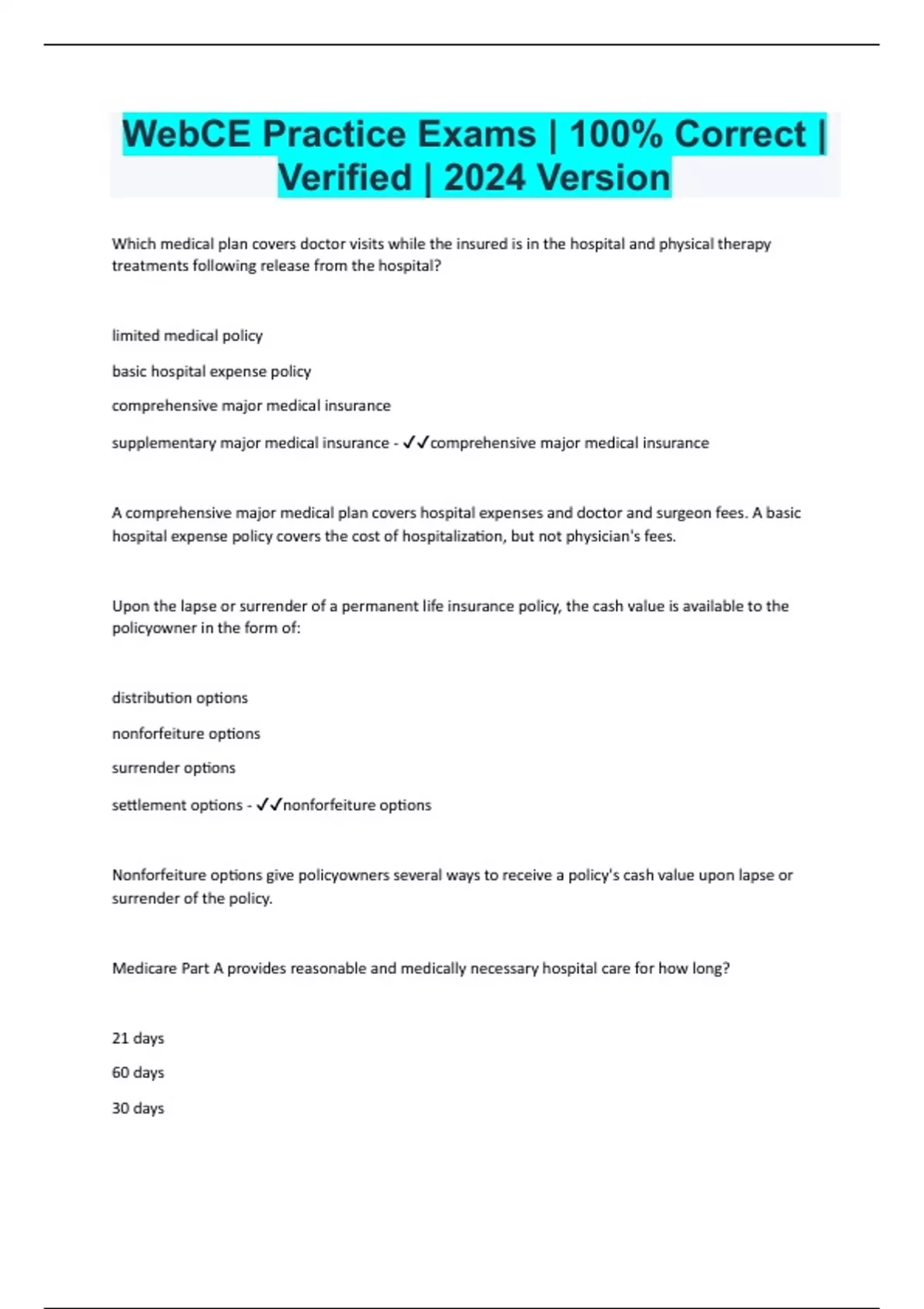 Which medical plan covers doctor visits while the insured is in the hospital and physical therapy treatments following release from the hospital? limited medical policy basic hospital expense policy comprehensive major medical insurance supplementary major medical insurance - comprehensive major medical insurance A comprehensive major medical plan covers hospital expenses and doctor and surgeon fees. A basic hospital expense policy covers the cost of hospitalization, but not physician's fees. Upon the lapse or surrender of a permanent life insurance policy, the cash value is available to the policyowner in the form of: distribution options nonforfeiture options surrender options settlement options - nonforfeiture options Nonforfeiture options give policyowners several ways to receive a policy's cash value upon lapse or surrender of the policy. Medicare Part A provides reasonable and medically necessary hospital care for how long? 21 days 60 days 30 days
