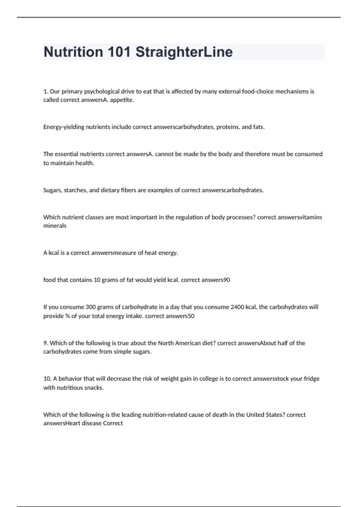 1. Our primary psychological drive to eat that is affected by many external food-choice mechanisms is called correct answersA. appetite. Energy-yielding nutrients include correct answerscarbohydrates, proteins, and fats. The essential nutrients correct answersA. cannot be made by the body and therefore must be consumed to maintain health. Sugars, starches, and dietary fibers are examples of correct answerscarbohydrates. Which nutrient classes are most important in the regulation of body processes? correct answersvitamins minerals A kcal is a correct answersmeasure of heat energy. food that contains 10 grams of fat would yield kcal. correct answers90 If you consume 300 grams of carbohydrate in a day that you consume 2400 kcal, the carbohydrates will provide % of your total energy intake. correct answers50 9. Which of the following is true about the North American diet? correct answersAbout half of the carbohydrates come from simple sugars. 10. A behavior that will decrease the risk of weight gain in college is to correct answersstock your fridge with nutritious snacks. Which of the following is the leading nutrition-related cause of death in the United States? correct answersHeart disease Correct
